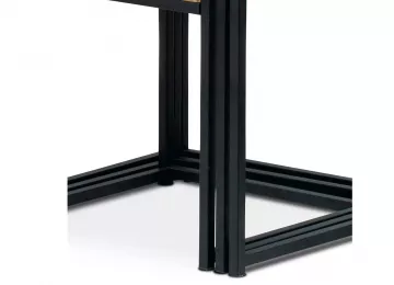 Štvorcové dosky z MDF v dekore divoký dub harmonicky dopĺňajú čierna kovová konštrukcia, ktorá tvorí aj nohy a celkovo stolíky spevňuje. Konštrukcia je štvorcového prierezu, na spodných plochách opatrená plastovými klzákmi.
