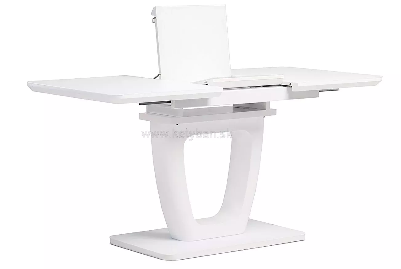 Vrchná stolová doska je tvrdeného skla hr. 4 mm v bielej farbe. Diel rozkladu je tiež krytý bielym sklom ako celá stolová doska, čo nepatrí k štandardom a radí stôl do vyššej kategórie. Podkladová doska, centrálna noha je z MDF je čisto biela v matnom prevedení. Podesta je tiež z MDF a krytá sklom vo farbe. Zo spodnej časti opatrená plastovými klzákmi, eliminujúce poškodenie povrchov tvrdých podláh. Mechanické súčasti sú kovové.