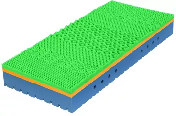 - pamäťová pena (oranžová vrstva) - vďaka ľudskému teplu optimalizuje svoju tuhosť. Je možné vybrať neprofilovaný povrch Classic alebo jemne masírujúci Wellness