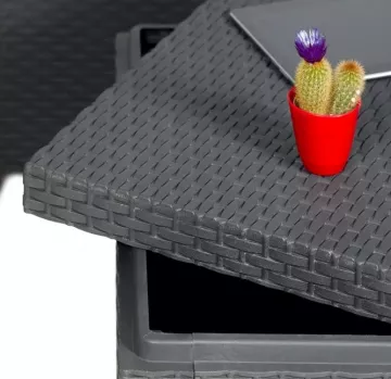 Zostava zahŕňa dômyselne navrhnutý stôl s funkciou úložného boxu a dvojicu kresiel doplnených o sofistikovanú dvojsedačku. Každý kus je starostlivo skonštruovaný z lisovaného plastu v elegantnom ratanovom dizajne, ktorý dodáva vašej záhrade moderný nádych a pôsobivý vzhľad.