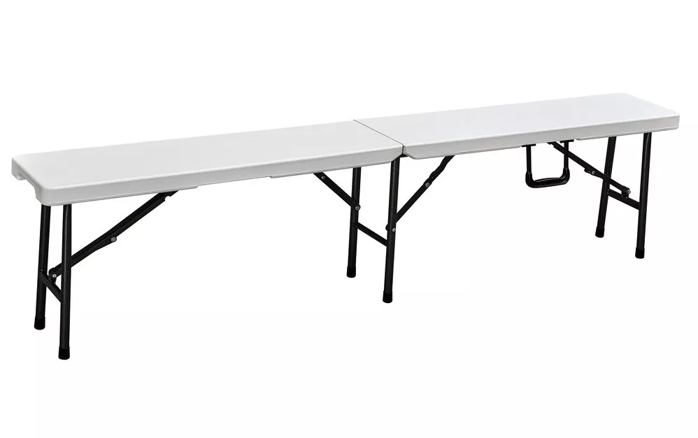 Skladacia Cateringová skladacia lavica z veľmi pevného materiálu HDPE s oceľovou konštrukciou. Konštrukcia je ošetrená kladivkovou farbou. Doska lavice je biela.