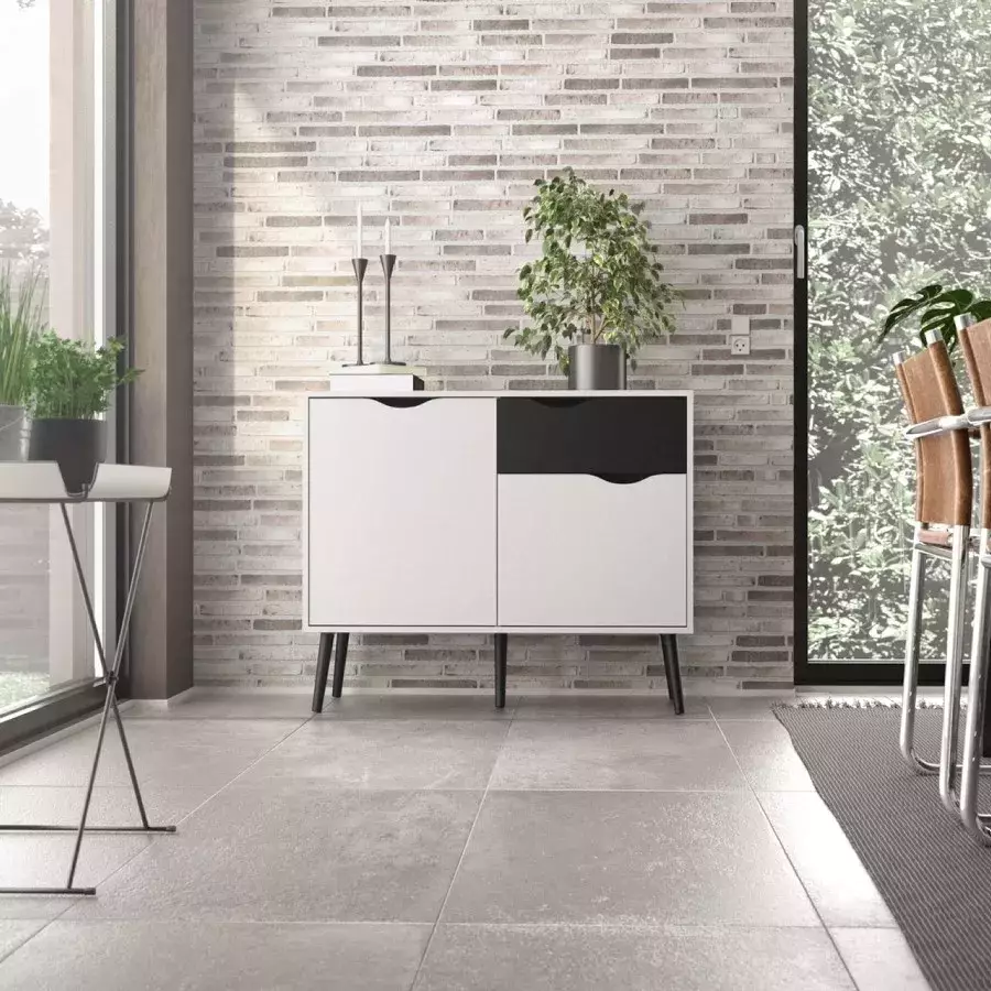 Komoda je vyrobená z odolného a ľahko udržiavateľného lamina s hrúbkou 15 mm, čo z nej robí funkčný a trvanlivý nábytok. Je vybavená dostatočným úložným priestorom, ktorý vám umožní udržať poriadok a organizáciu vo vašom dome. Retro vzhľad komody je zdôraznený vysokými šikmými nôžkami a oblúkovými výrezmi namiesto tradičných úchytiek.