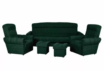 Vďaka kombinácii trojsedu, dvoch kresiel a dvoch taburetov je vhodná aj pre viacčlennú rodinu. Sedáky z PUR peny zaisťujú komfortné sedenie a vyššie opierky ocenia predovšetkým seniori.