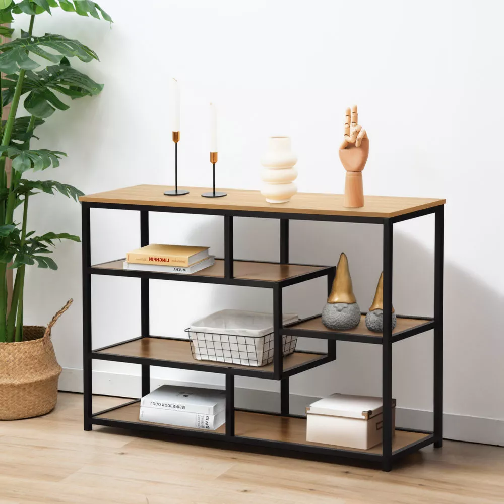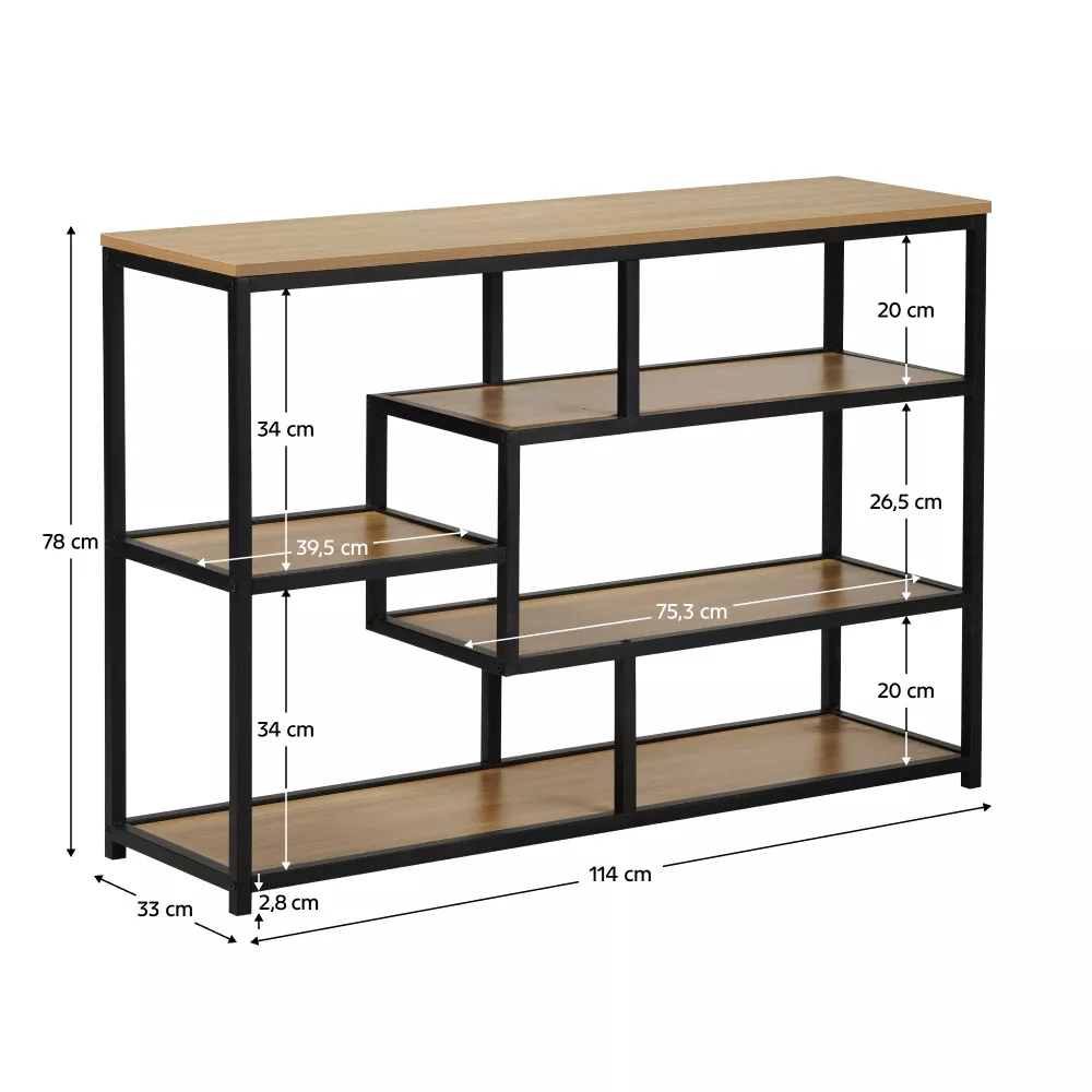 Regál BILOTE TYP 2 je štýlovým a zároveň praktickým doplnkom, ktorý nájde uplatnenie nielen v obývacej izbe, ale aj v predsieni, spálni či pracovni. Jeho čierna kovová konštrukcia pôsobí moderným a nadčasovým dojmom, zároveň zaisťuje stabilitu a dlhú životnosť. Päť otvorených políc v rôznych výškach poskytuje dostatok priestoru na usporiadanie kníh, úložných boxov, dekorácií či kvetov.