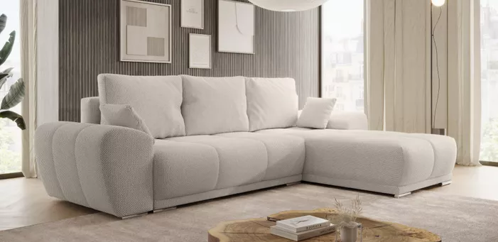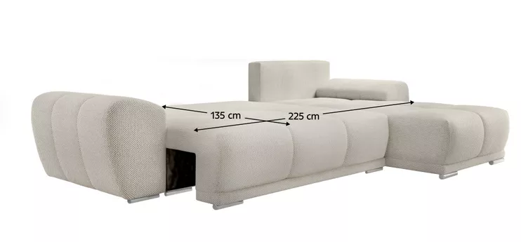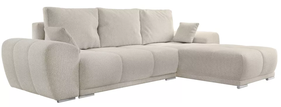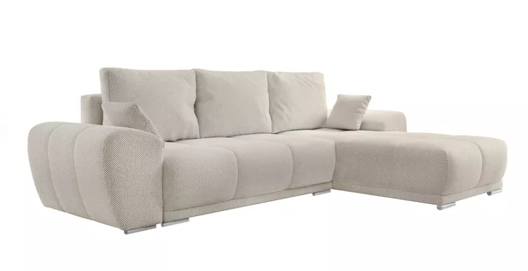 Moderná rohová sedacia súprava, ktorá spája pohodlie, štýl a funkčnosť. Čalúnenie v krémovej látke Curio pôsobí elegantne a vďaka celočalúnenému prevedeniu je možné ju umiestniť aj do priestoru. Univerzálne prevedenie umožňuje zostavenie na ľavý alebo pravý roh podľa vašich potrieb. Sedačka disponuje priestranným úložným priestorom, funkciou rozkladu s plochou na spanie 135×225 cm a pohodlnými vankúšmi, ktoré zaisťujú komfortnú oporu chrbta. Výplň tvoria vlnité pružiny a PUR pena, ktoré garantujú maximálne pohodlie pri sedení aj ležaní. Stabilné plastové nožičky v striebornom prevedení podčiarkujú moderný vzhľad.