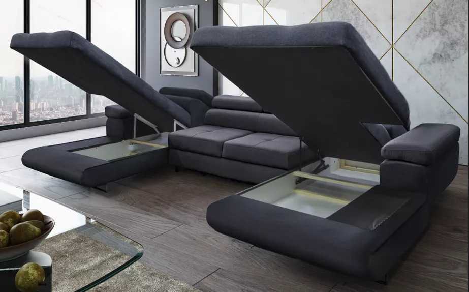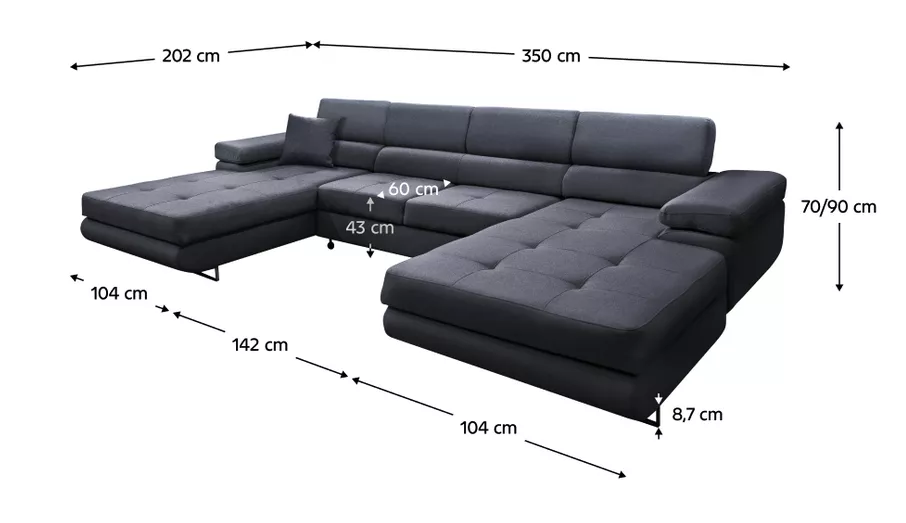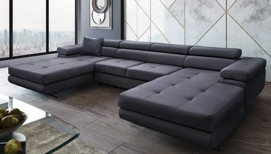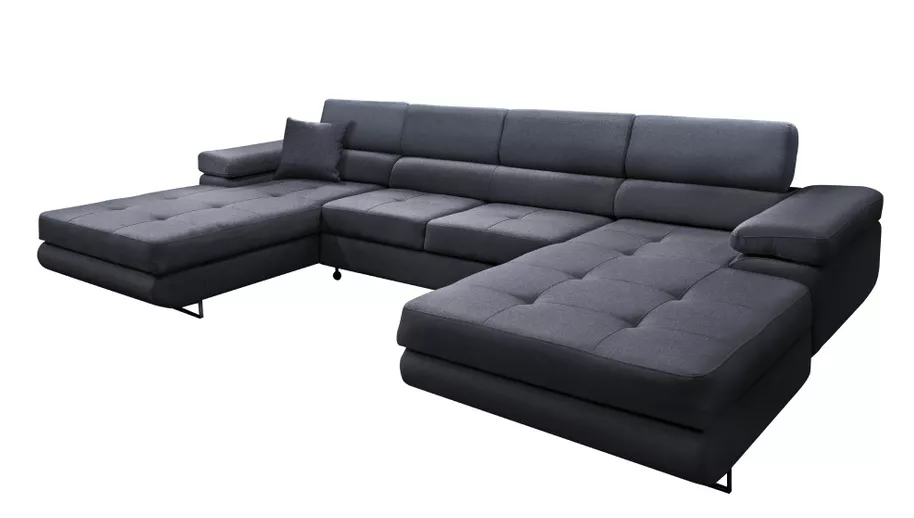 Elegantná sedacia súprava v tvare U , ktorá spája moderný dizajn, kvalitné materiály a praktické funkcie. Čalúnenie v šedej látke Monolith pôsobí nadčasovo a vďaka celočalúnenému prevedeniu je možné sedačku umiestniť aj do priestoru. Ponúka štyri polohovateľné opierky hlavy s možnosťou nastavenia v šiestich stupňoch, úložný priestor a rozklad, vďaka ktorému vznikne lôžko o rozmere 125×285 cm. Dekoratívne šitie sedacej časti a kovové nožičky v striebornom prevedení podčiarkujú elegantný vzhľad.