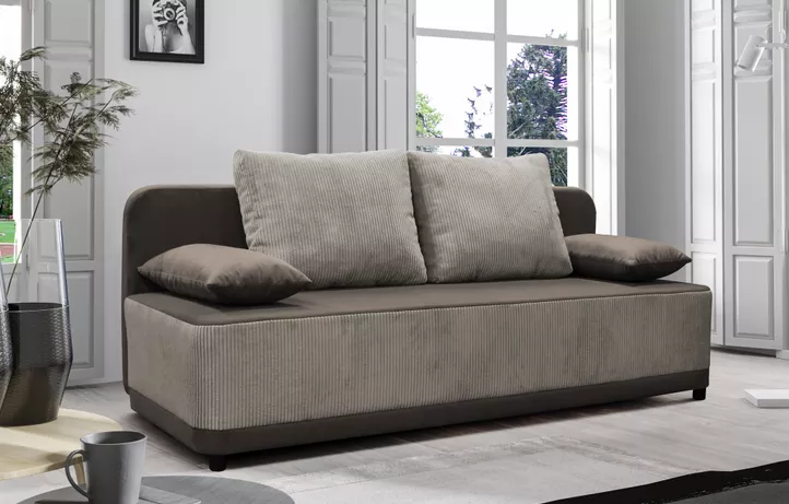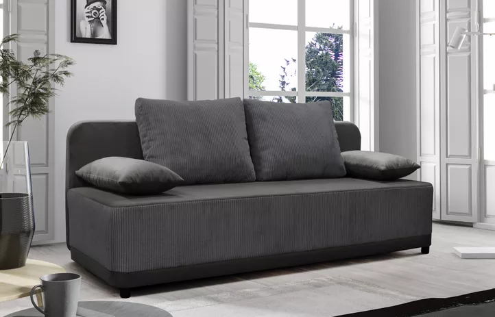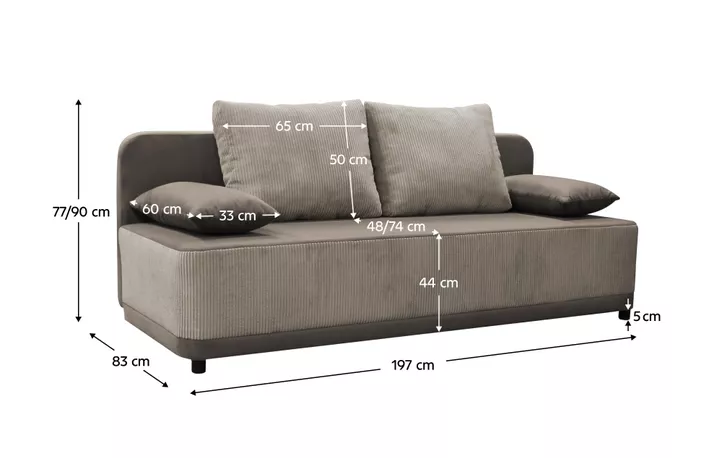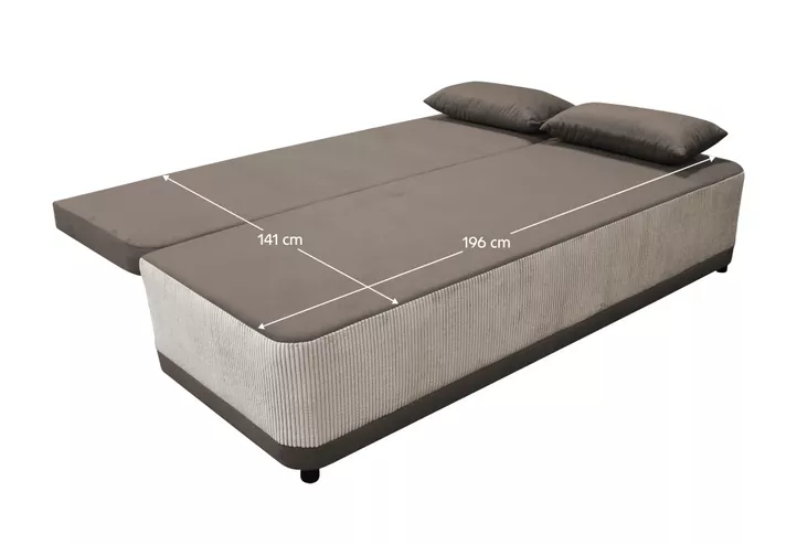 Praktická funkcia rozkladu umožňuje behom chvíľky vytvoriť plnohodnotné lôžko o rozmere 141×196 cm . Pohovka disponuje aj úložným priestorom, ideálnym pre uloženie diek, prikrývok či sezónneho oblečenia. Stabilitu zaisťujú čierne plastové nožičky ao komfortné sedenie sa postará PUR pena. Súčasťou sú aj vankúše, ktoré dodajú ešte viac pohodlia.