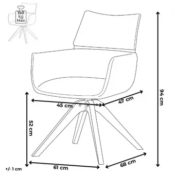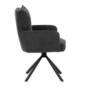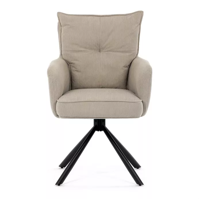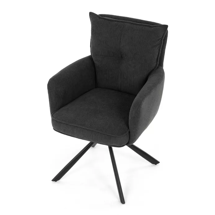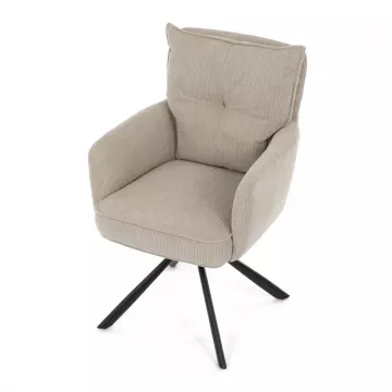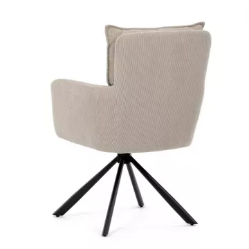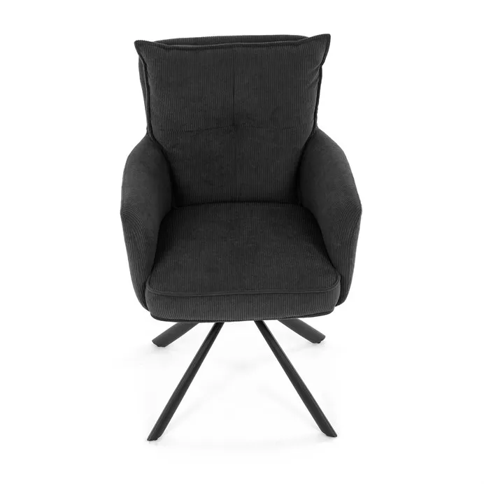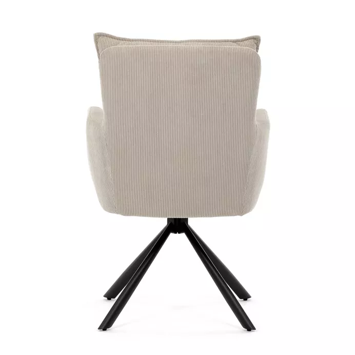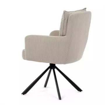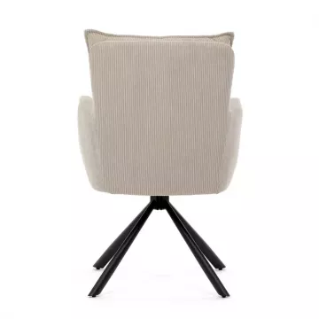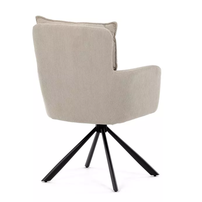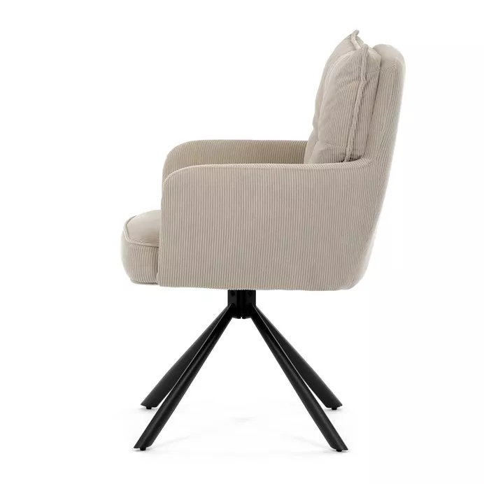 Stolička disponuje praktickou otočnou funkciou s rozsahom 180 ° a vratným mechanizmom reset, ktorý ju automaticky vracia do pôvodnej polohy. To uľahčuje manipuláciu a zároveň zvyšuje pohodlie pri používaní. Stabilné podnož z čierno lakovaného kovu zaisťuje pevnosť a dlhú životnosť, pričom svojim dizajnom podčiarkuje moderný vzhľad celého modelu.