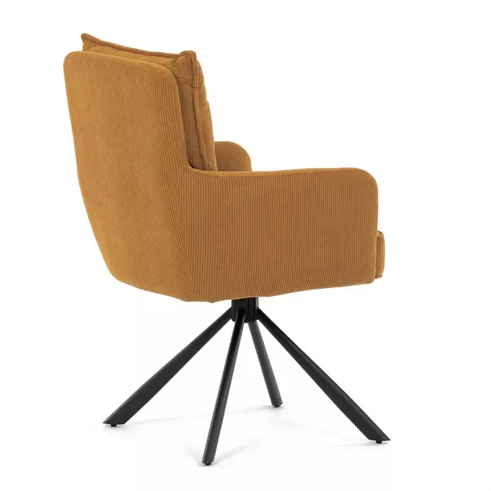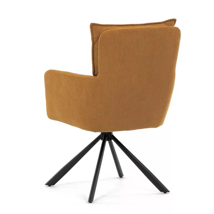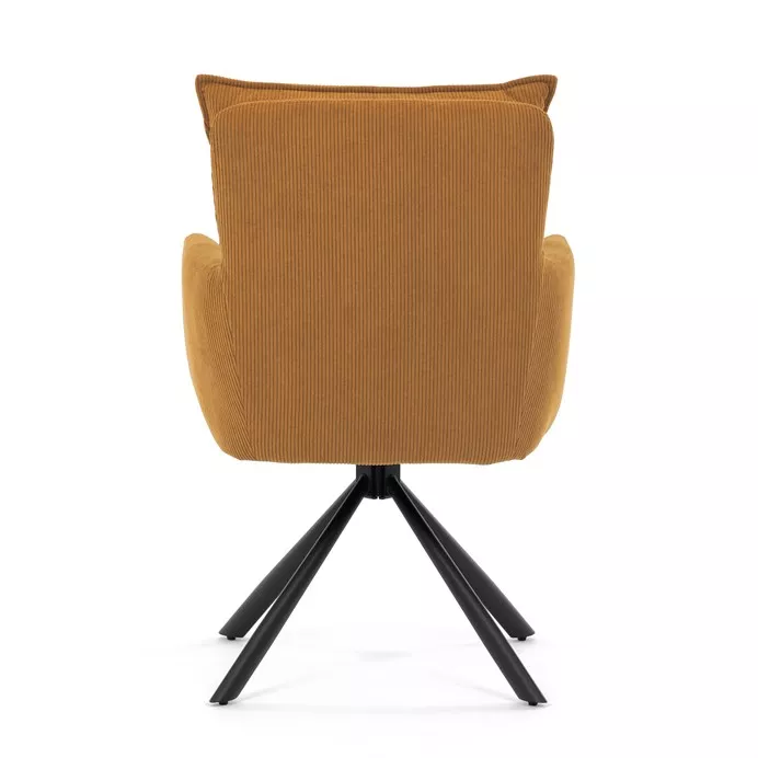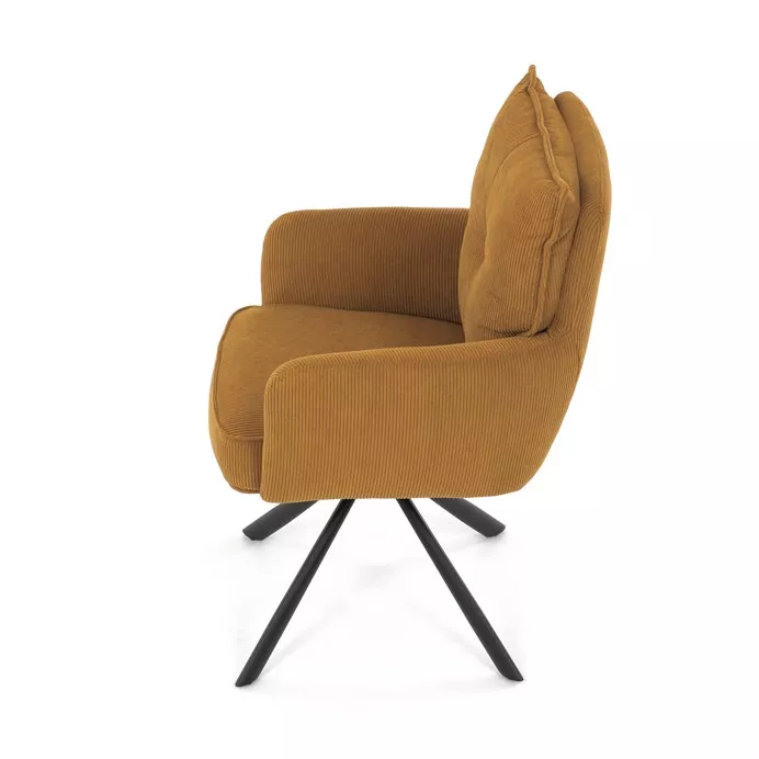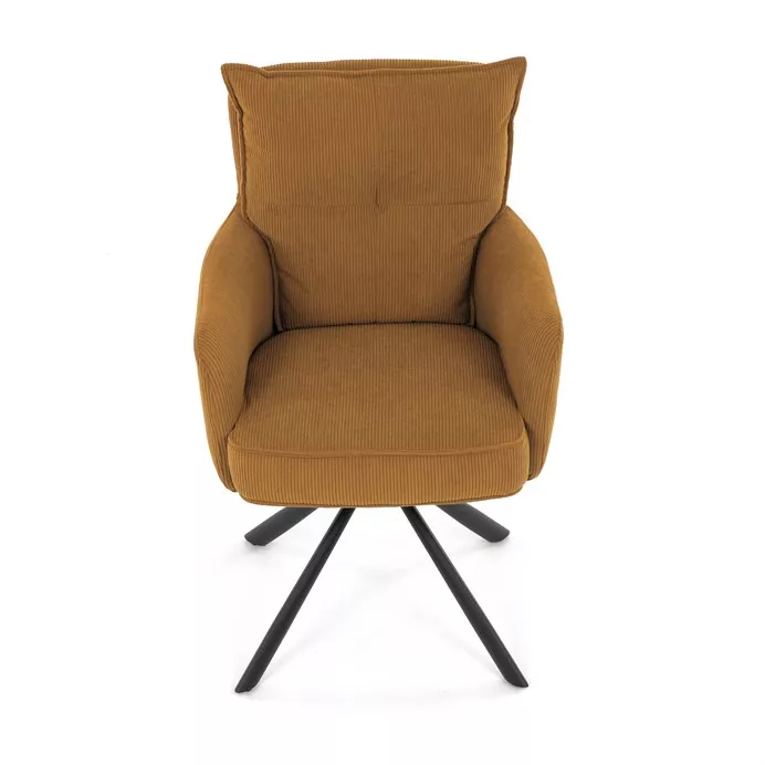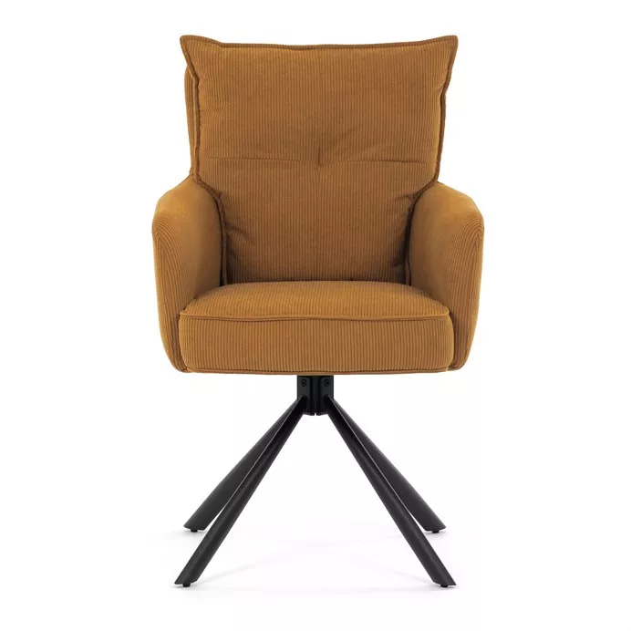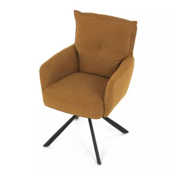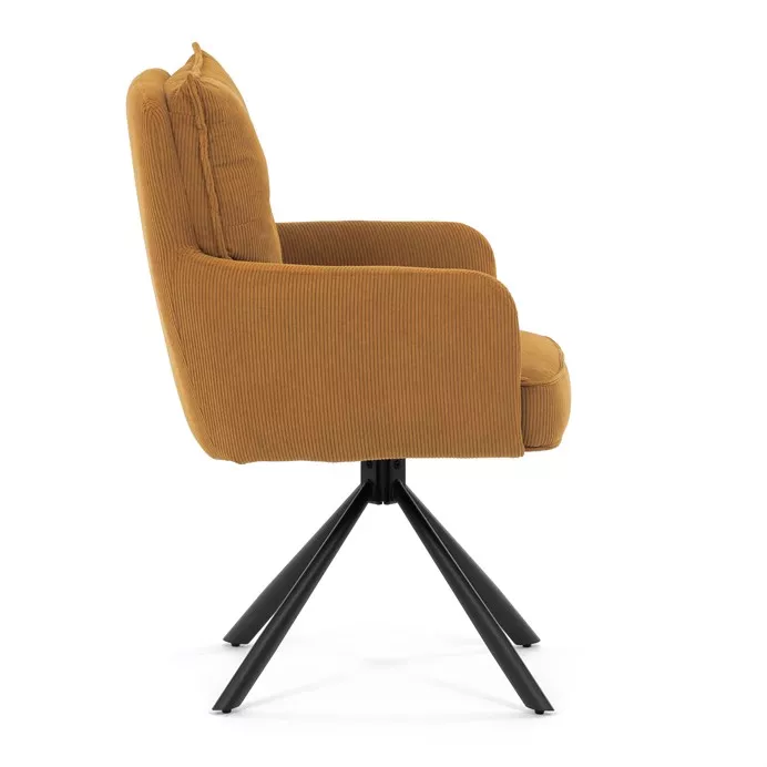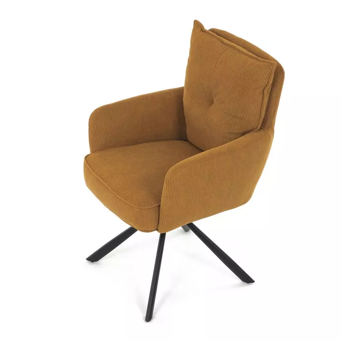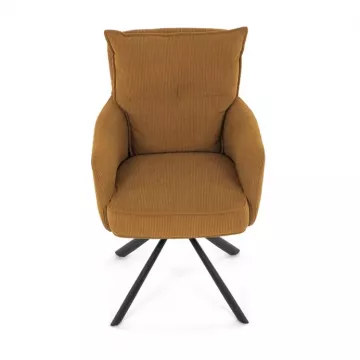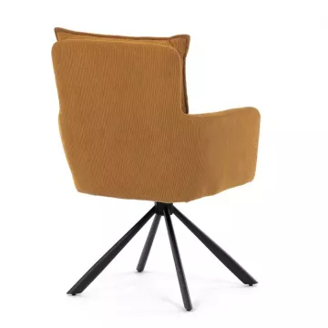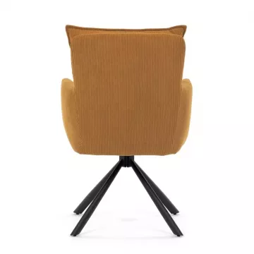 Štýlová jedálenská stolička prináša spojenie pohodlia, praktickosti a moderného dizajnu. Vysoké polstrovanie sedadla i operadla v atraktívnej žltej menčestrovej látke zaisťuje komfort pri každodennom sedení. Sedák je vybavený taštičkovými pružinami , ktoré zvyšujú pružnosť a dlhodobú elasticitu. Integrované podrúčky poskytujú príjemnú oporu rúk a prispievajú k ergonomickému sedeniu.