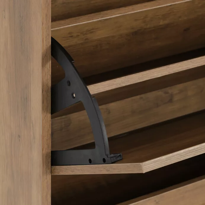 Korpus je vyrobený z kvalitných MDF dosiek s povrchovou úpravou verne napodobňujúcou prírodnú štruktúru dreva. Vďaka pevnej konštrukcii je botník stabilný, odolný a ľahko udržiavateľný. Je praktickým pomocníkom, ktorý spája funkčnosť s moderným štýlom.