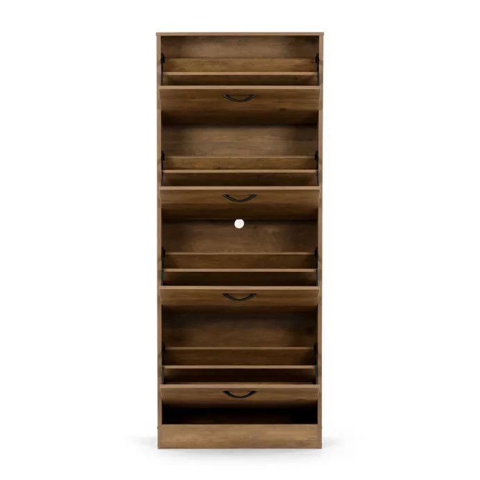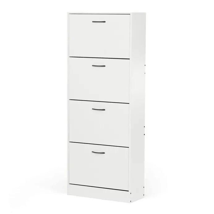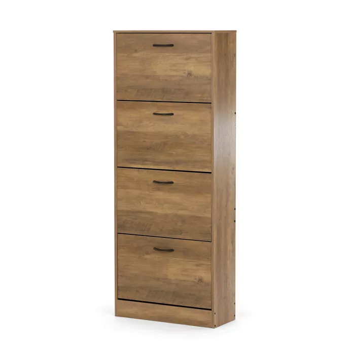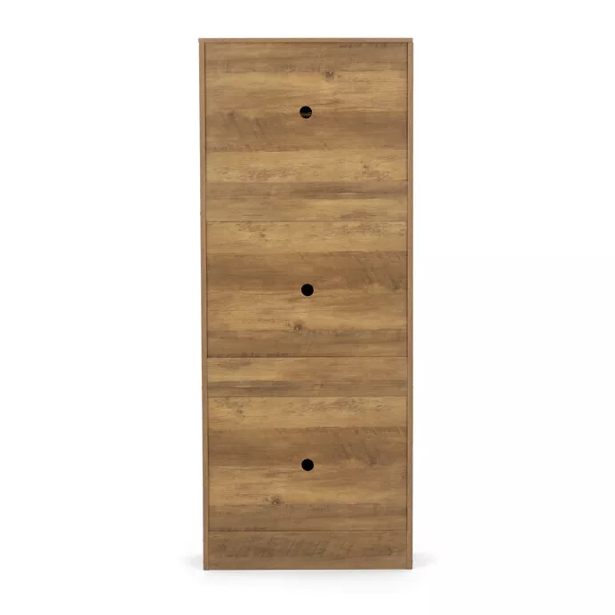Botník so štyrmi priehradkami v dekore dub je ideálnym riešením na prehľadné uloženie obuvi a udržanie poriadku v domácnosti. Vysoké a kompaktné prevedenie ponúka dostatok priestoru bez toho, aby zaberalo veľa miesta, a preto sa hodí aj do menších predsiení, chodieb či šatní. Každá priehradka je opatrená čiernou kovovou úchytkou, ktorá uľahčuje otváranie a zatváranie.