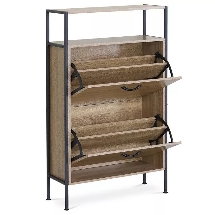 Usporiadajte svoju obuv prehľadne a elegantne s botníkom, ktorý kombinuje praktické funkcie s moderným industriálnym štýlom. Dve priestranné priehradky s čiernymi úchytkami poskytujú dostatok miesta pre viac párov topánok, zatiaľ čo dve police sú ideálne pre každodenne nosenú obuv alebo drobnosti. Hornú dosku je možné využiť na odkladanie dekorácií či praktických predmetov.