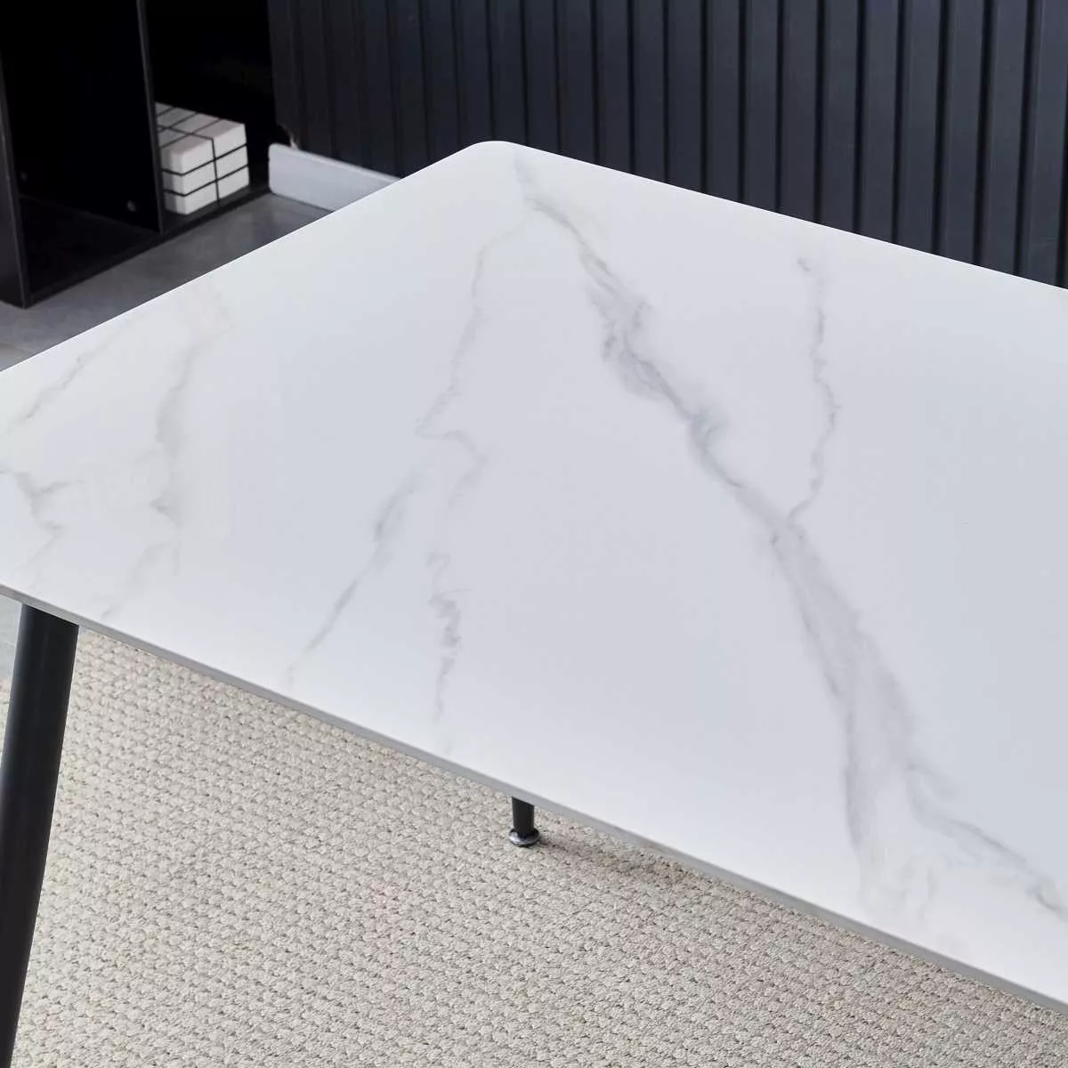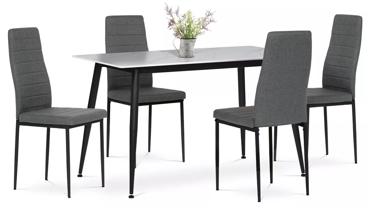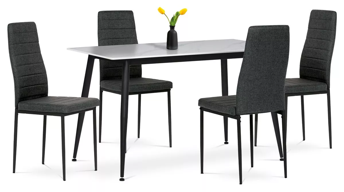 Dodajte svojej jedálni štýl a charakter s moderným jedálenským setom Autronic. Obdĺžnikový stôl s doskou zo spekanej keramiky v bielom mramorovom dekóre pôsobí luxusne, zároveň je odolný voči poškriabaniu a ľahko sa udržuje. Čierne kovové nohy so subtílnym kónickým tvarom zaisťujú stabilitu a dokonale ladia so stoličkami. Tie sú čalúnené hladkou čiernou látkou, majú ergonomicky tvarovanú opierku a poskytujú pohodlné sedenie na každodenné stolovanie. Set je skvelou voľbou pre rodiny aj moderné interiéry, kde sa kĺbi funkčnosť s eleganciou.