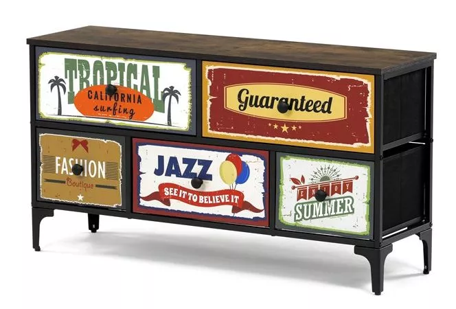 Retro komoda AUK-W2103 v sebe spája jedinečný štýl a funkčnosť. Textilné čelá zásuviek s výplňou MDF a vintage potlačou evokujú atmosféru starých amerických barov a jazzových klubov. Kombinácia čiernej kovovej konštrukcie, dosky v dekore starého dreva a ozdobne tvarovaných nôh dodáva komode robustný, ale zároveň elegantný vzhľad.