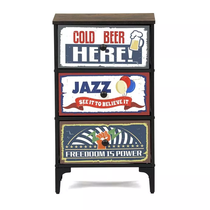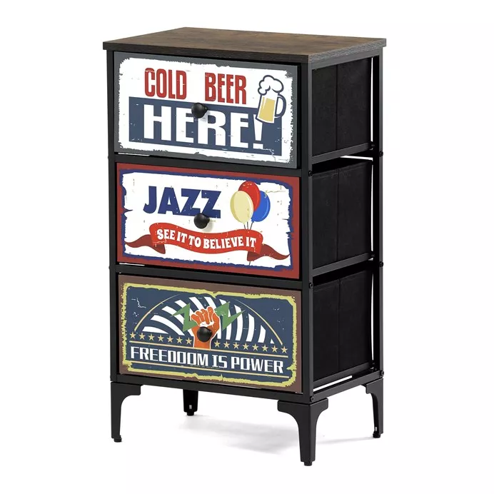 Retro komoda Auk-w2001 prinesie do vášho interiéru jedinečný šarm a originalitu. Textilné čelá zásuviek s výplňou HDF a vintage potlačou pripomínajú atmosféru starých amerických barov a jazzových klubov. Kombinácia čiernej kovovej konštrukcie, dosky v dekore starého dreva a ozdobných nôh dodáva nábytku robustný, napriek tomu elegantný vzhľad.