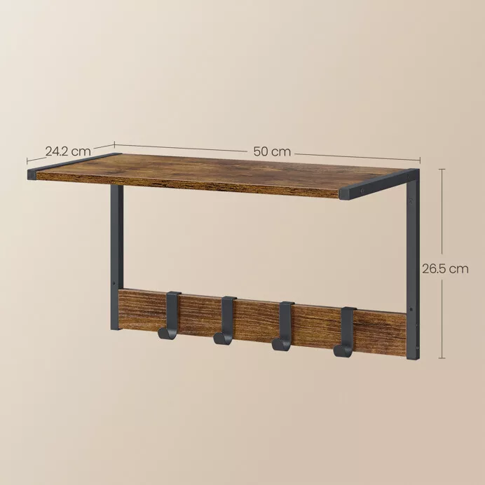 Vďaka univerzálnym rozmerom 50 × 24 × 27 cm a kombinácii dreva a kovu sa polica skvele hodí do obývacej izby, kuchyne, chodby aj pracovne, kde poslúži ako štýlový aj praktický doplnok.