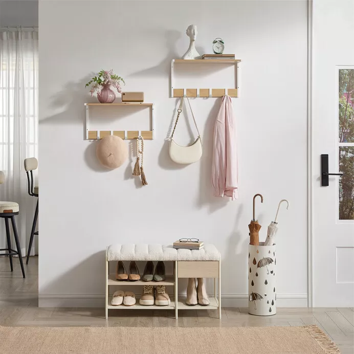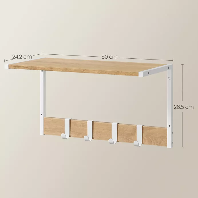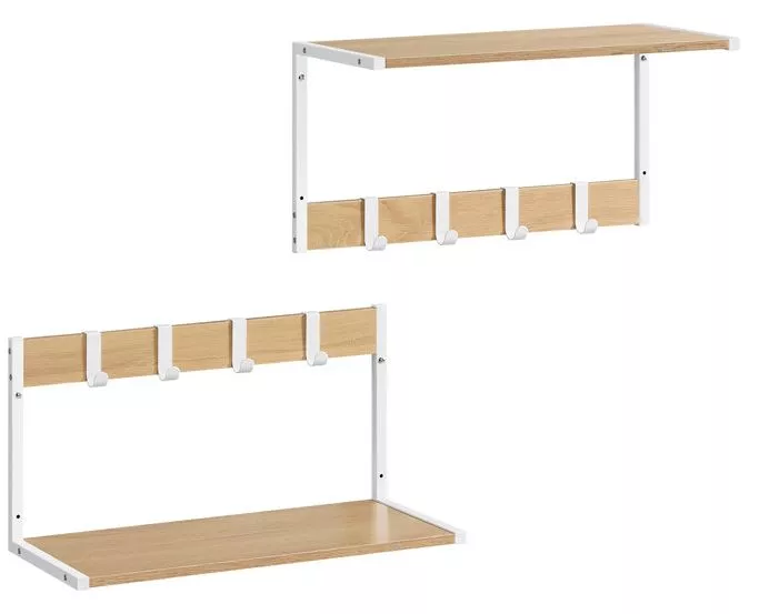 Táto sada dvoch nástenných políc kombinuje MDF dosky v dekore dubového dreva s pevnými kovovými vzperami v čiernej farbe, ktoré zaisťujú stabilitu, odolnosť a dlhú životnosť. Každá polica ponúka praktický odkladací priestor doplnený o štyri kovové háčiky, vhodné na zavesenie kľúčov, drobných doplnkov, kuchynského náčinia či dekorácií.