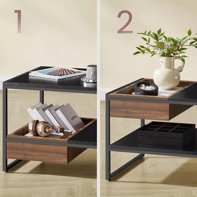 Stolík ponúka praktický úložný priestor v podobe otvorenej police a zásuvky, ktorá svojim dekorom podčiarkuje prírodný charakter nábytku. Povrch dosky je matný, odolný voči poškriabaniu a ľahko sa udržuje.