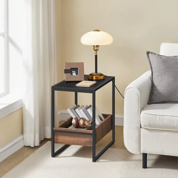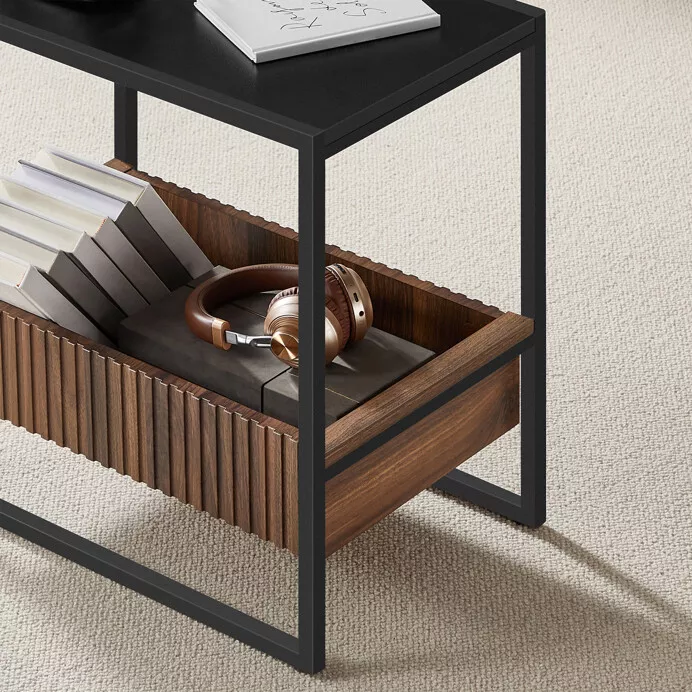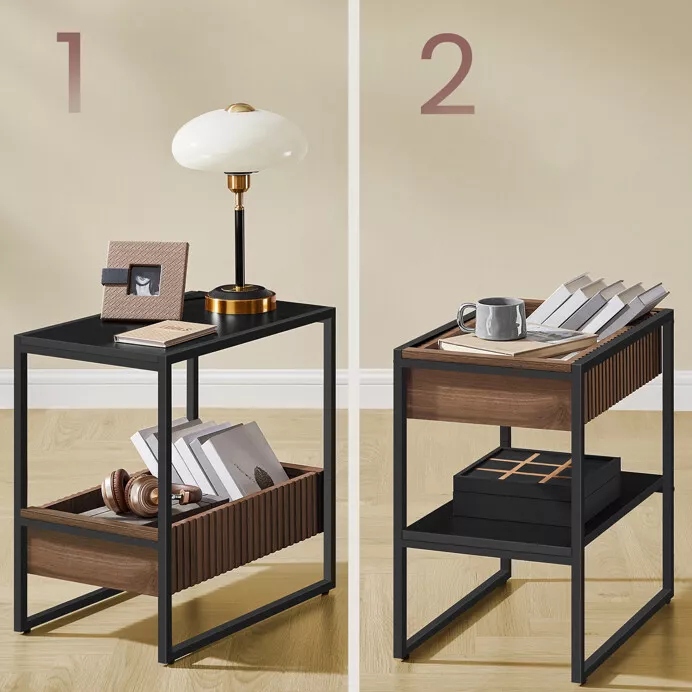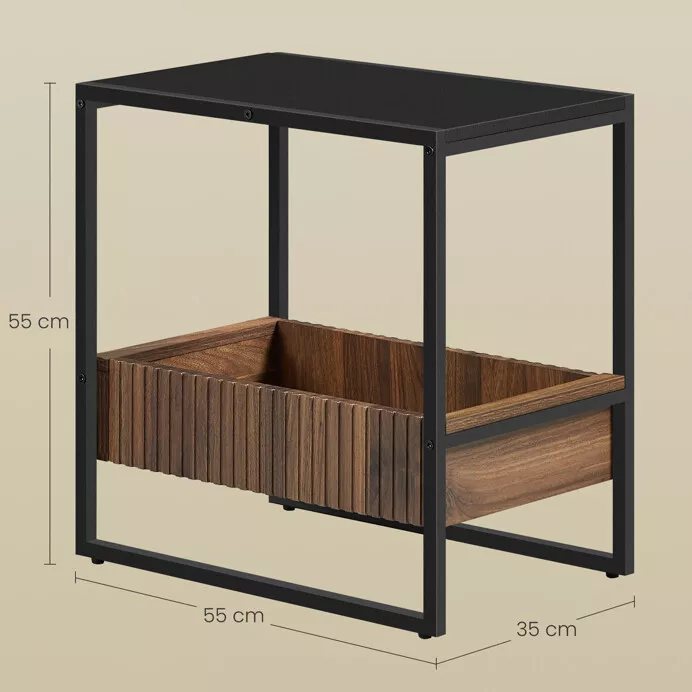 Tento odkladací stolík s rozmermi 55 × 35 × 56 cm spája eleganciu dreva a stabilitu kovu v dokonale vyváženom dizajne. Pevná kovová konštrukcia v čiernej matnej úprave dodáva stolíku industriálny charakter, zatiaľ čo horná doska z MDF a prírodná zásuvka v dekore orech vnášajú do interiéru teplý a prirodzený kontrast.