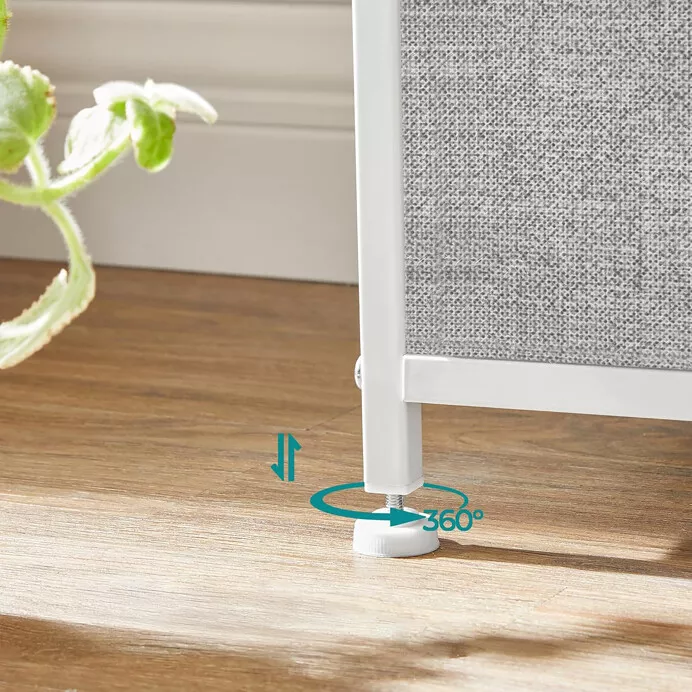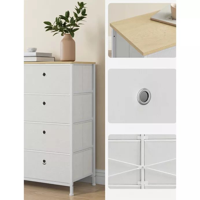 Moderná komoda s rozmermi 80 × 30 × 82 cm kombinuje pevnú kovovú konštrukciu s doskou z MDF v matnom bielom prevedení, ktorá zaisťuje stabilitu, odolnosť a jednoduchú údržbu. Osem šedých látkových zásuviek poskytuje dostatok úložného priestoru na oblečenie, doplnky alebo drobnosti a zároveň pôsobí ľahko a vzdušne.