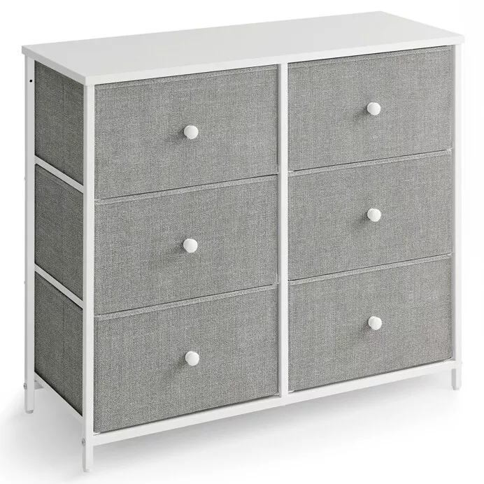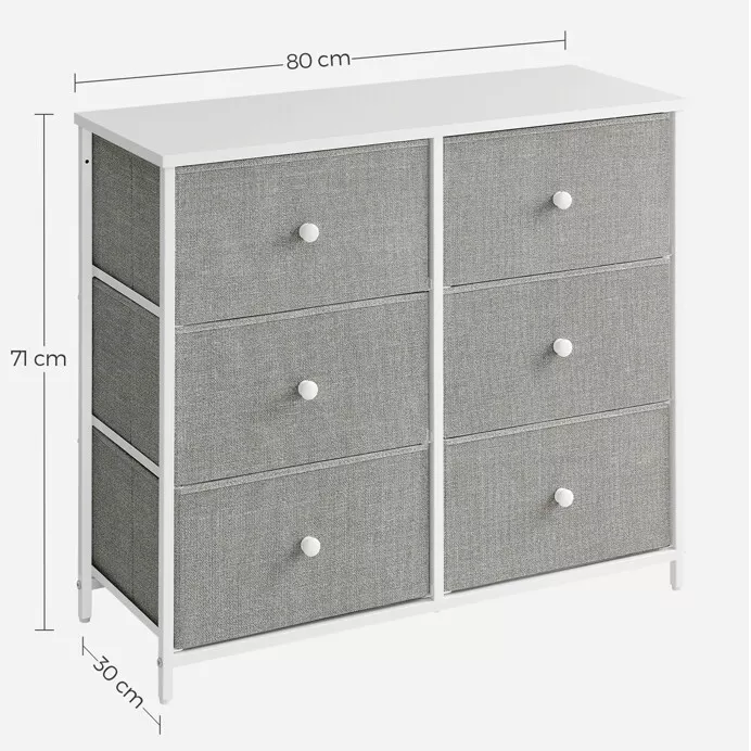 Moderná komoda s rozmermi 80 × 30 × 71 cm spája pevnú MDF dosku v matnej bielej úprave so stabilnou kovovou konštrukciou v šedej farbe, ktorá zaručuje pevnosť a dlhú životnosť. Šesť priestranných zásuviek z netkanej textílie poskytuje dostatok úložného priestoru na oblečenie, doplnky aj domáce drobnosti. Vďaka okrúhlym úchytkám je manipulácia jednoduchá a pohodlná.
