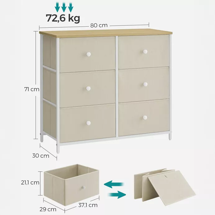 Štýlová komoda s rozmermi 80 × 30 × 71 cm spája MDF dosku v dekore duba s matnou povrchovou úpravou a stabilnú kovovú konštrukciu v bielej farbe, ktorá zaisťuje pevnosť, odolnosť aj dlhú životnosť. Šesť priestranných zásuviek z netkanej textílie v béžovom odtieni ponúka praktické úložné riešenie pre oblečenie, doplnky či domáce potreby.