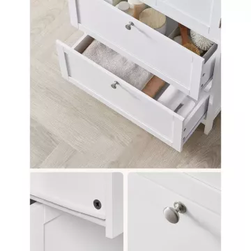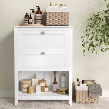 Elegantná kúpeľňová skrinka s rozmermi 60 × 30 × 80 cm je vyrobená z kvalitnej MDF s matnou bielou povrchovou úpravou, ktorá je odolná voči vlhkosti a ľahko sa udržuje. Ponúka dva priestranné výklopné úložné priestory s decentnými kovovými úchytkami pre pohodlný prístup k uloženým veciam.