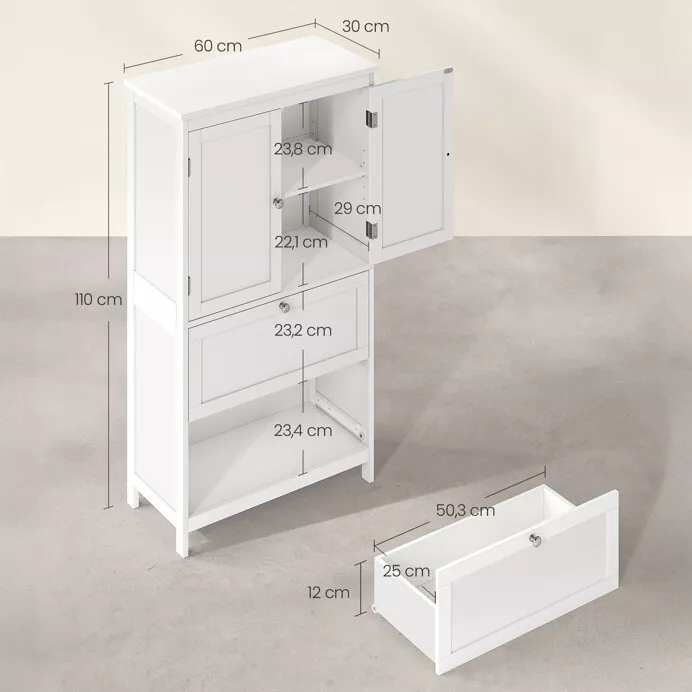 Elegantná kúpeľňová skrinka s rozmermi 60 × 30 × 80 cm je vyrobená z kvalitnej MDF s matnou bielou povrchovou úpravou, ktorá je odolná voči vlhkosti a ľahko sa udržuje. Ponúka dva priestranné výklopné úložné priestory s decentnými kovovými úchytkami pre pohodlný prístup k uloženým veciam.