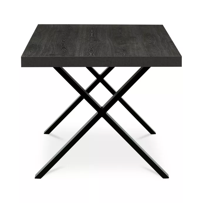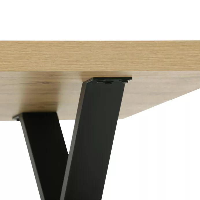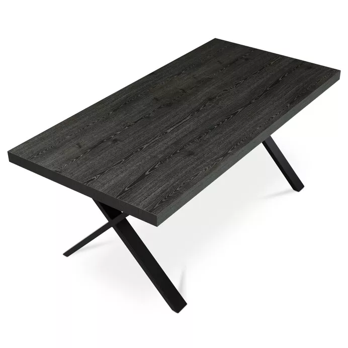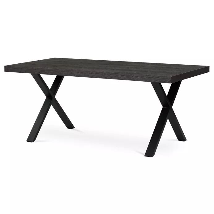 Stabilitu zaručuje masívna kovová podnož v tvare X v čiernom matnom prevedení, ktorá dodáva stolu moderný industriálny charakter a zároveň umožňuje pohodlné sedenie z oboch strán. Stôl je navrhnutý bez rozkladacej funkcie, čo podčiarkuje jeho jednoduchosť, pevnosť a nadčasovosť.