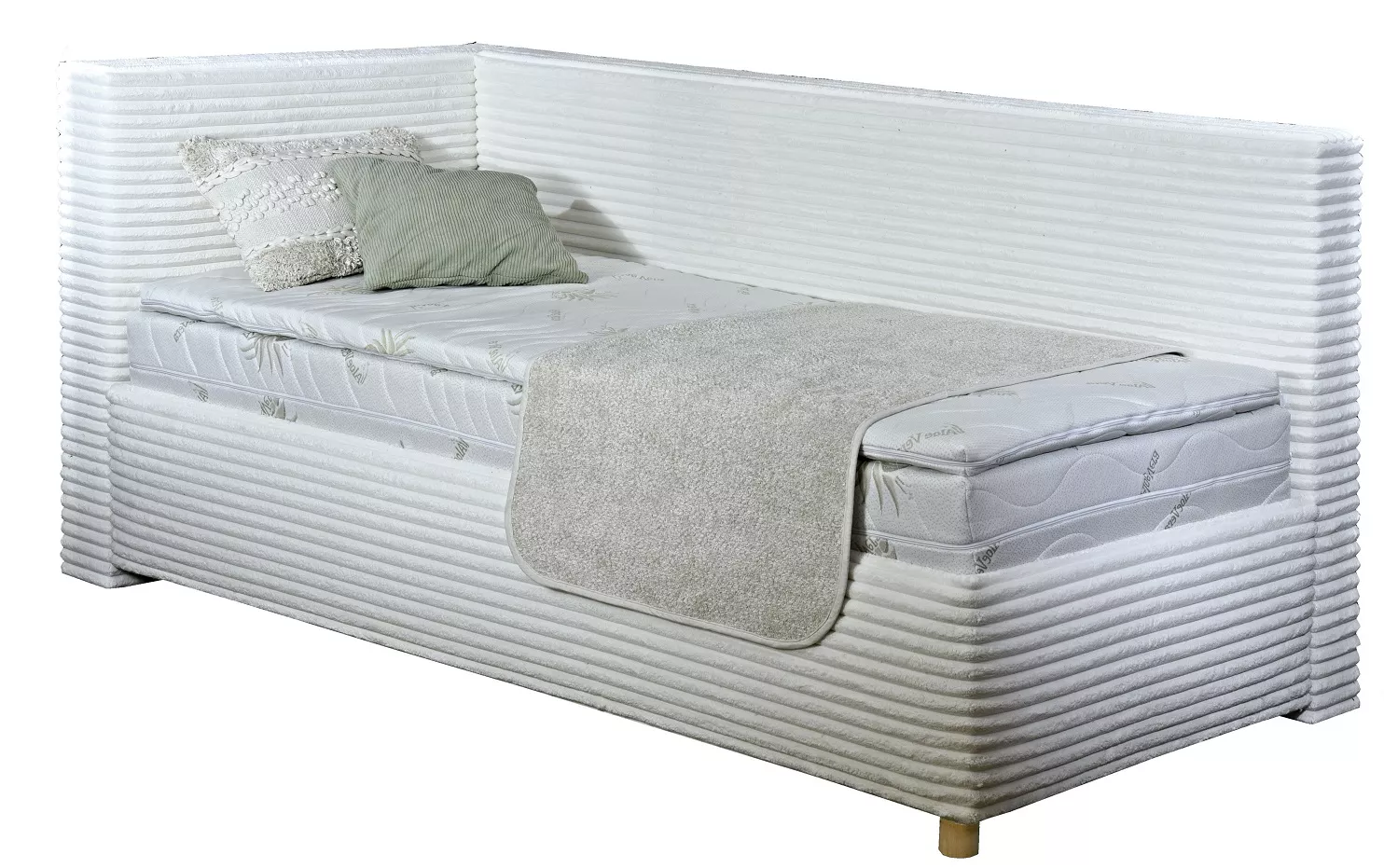 Iste oceníte aj úložný priestor na uskladnenie lôžkovín. Bočnice sú vyrobené z bieleho lamina hrúbky 18 mm. Dno je vyhotovené z bielej MDF. Pohľadové strany sú zmäkčené polyesterovým rúnom. Uchytenie okrasnej nohy je riešené oceľovým výliskom.