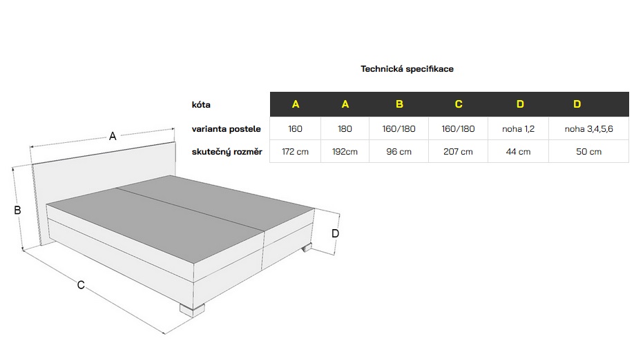 - Výška ložnej plochy 44/50 cm (podľa výšky nôh)