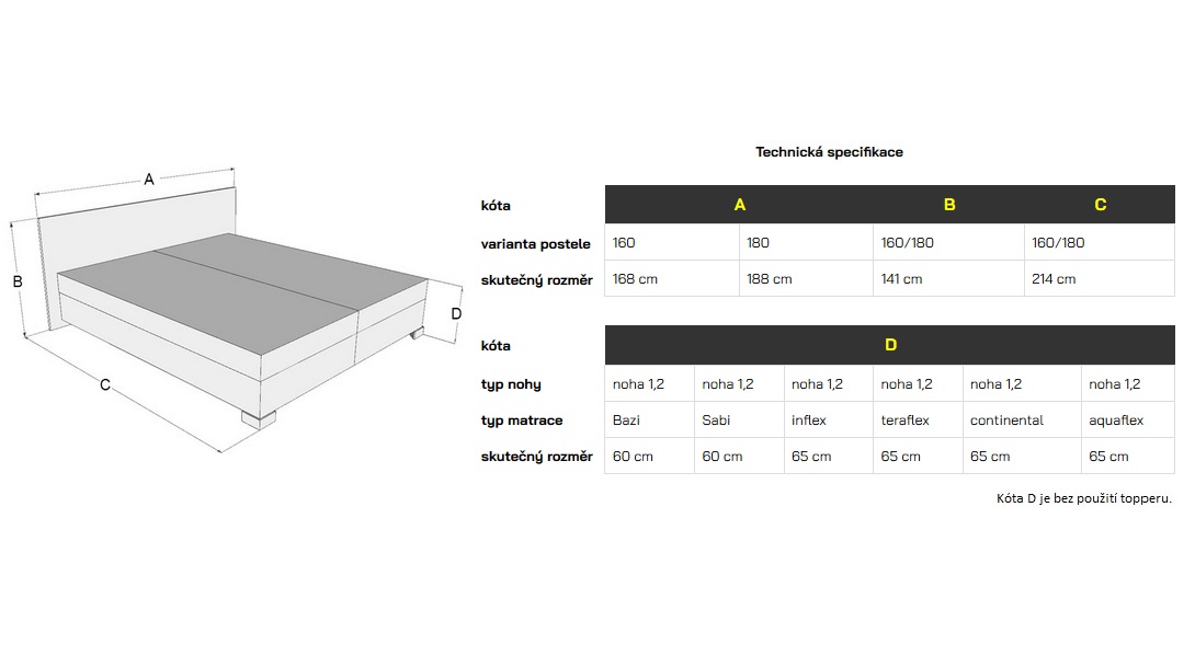 Úložný priestor je vyrobený z bieleho lamina hrúbky 18 mm. Dno je vyhotovené z bielej MDF. Pohľadové strany sú zmäkčené polyesterovým rúnom. Uchytenie okrasnej nohy je oceľovým výliskom (noha sa zaskrutkuje do výlisku). Spojenie pravej a ľavej strany letiska je zaistené stredovou oceľovou nastavovacou nohou. Na spojenie matraca s úložným priestorom je použitý výklopný mechanizmus s plynovými piestami.
