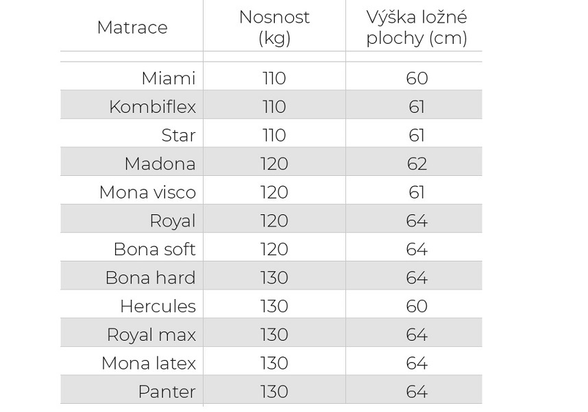 Nosnosť - podľa typu úložného priestoru a matraca.