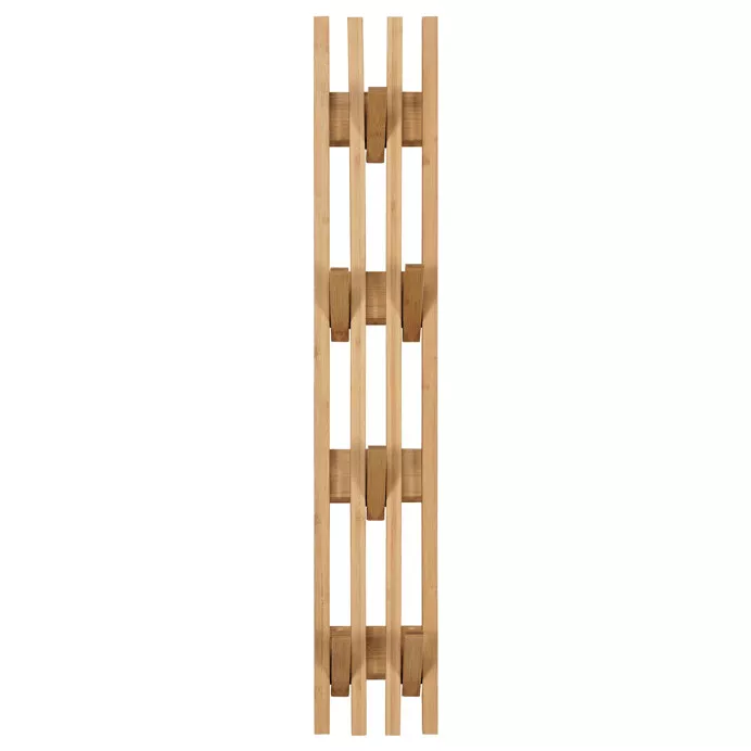 Konštrukcia tvorená štyrmi zvislými lištami a háčikmi rozmiestnenými v troch úrovniach umožňuje prehľadné zavesenie kabátov, tašiek alebo doplnkov. Pevný bambusový materiál zaisťuje stabilitu, dlhú životnosť a prirodzený vzhľad, ktorý sa hodí do rôznych štýlov interiéru. Jednoduchá montáž a kompaktné rozmery umožňujú umiestnenie v predsieňach, kúpeľniach alebo kanceláriách.