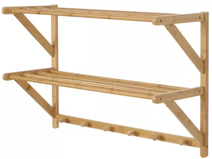 Polica ponúka dve pevné úložné plochy tvorené bambusovými tyčami, ktoré sú ideálne na odkladanie textilu, uterákov či drobných dekorácií. V spodnej časti sa nachádza šesť okrúhlych vešiakov, vhodných pre kabáty, šály alebo tašky. Kvalitné spracovanie a pevné uchytenie na stenu zaručujú stabilitu a dlhú životnosť. Vďaka jednoduchému dizajnu a prírodnému materiálu sa hodí do predsiení, chodieb, kúpeľní i spální.