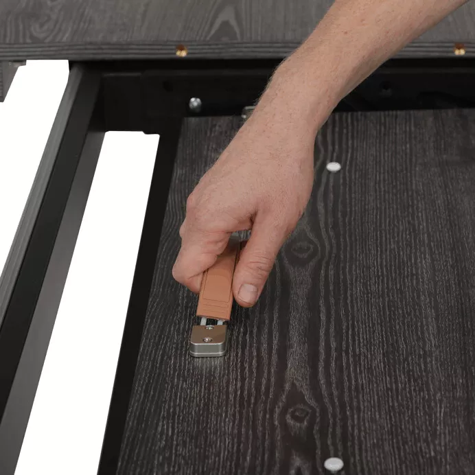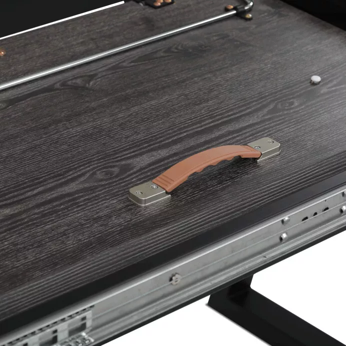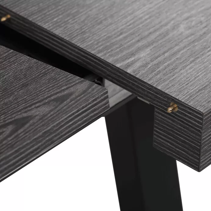 Doska z kvalitného lamina v dekore šedého duba je opatrená ABS hranou, ktorá chráni okraje pred poškodením a zaisťuje jednoduchú údržbu. Matná povrchová úprava dodáva stolovej doske elegantný vzhľad a zároveň znižuje viditeľnosť odtlačkov prstov. Pevná kovová podnož v čiernej farbe poskytuje stabilitu a dlhú životnosť.