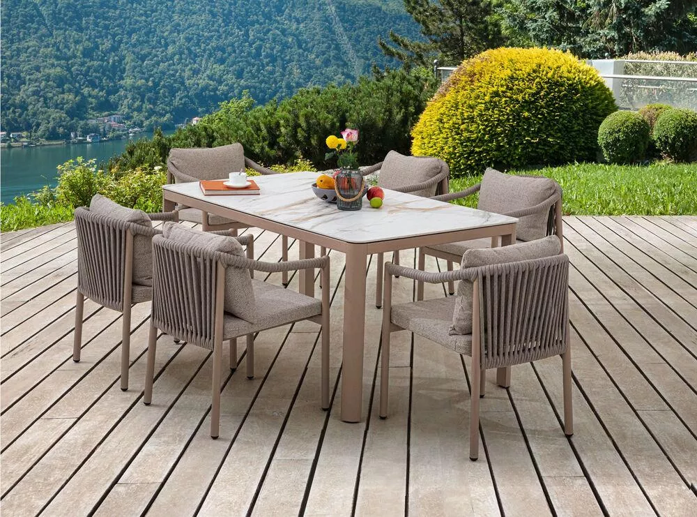 BOISE - jedálenská hliníková súprava CAPPUCCINO kombinuje elegantný dizajn, kvalitné materiály a maximálnu praktickosť. Hliníková konštrukcia v modernom cappuccino odtieni je doplnená o atraktívny lankový (povrázkový) výplet, ktorý dodáva zostave ľahkosť a štýlový vzhľad. Vďaka vysokej odolnosti materiálov je súprava vhodná do exteriéru aj interiéru - na záhrady, terasy, do zimných záhrad, ale aj do recepcií či uvítacích priestorov.