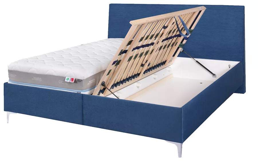 Čalúnená základňa postele Merkúr je navrhnutá v tvare pevného boxu a ponúka odvetrávané úložné priestory prístupné pomocou vyklápacích mechanizmov s plynovými vzperami. Bočný výklop roštov zaisťuje pohodlný prístup do úložnej časti bez nutnosti manipulácie s matracom.