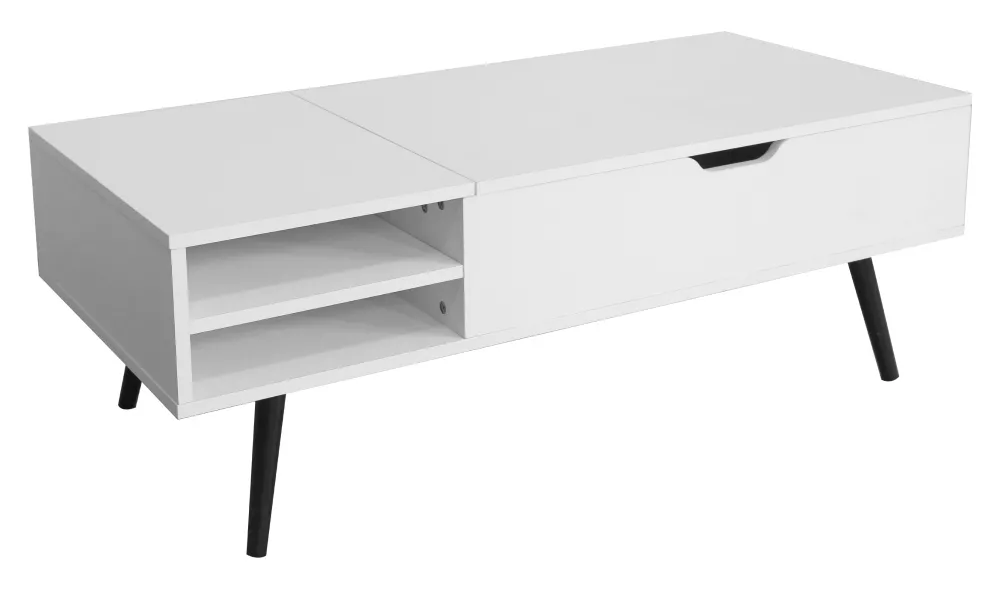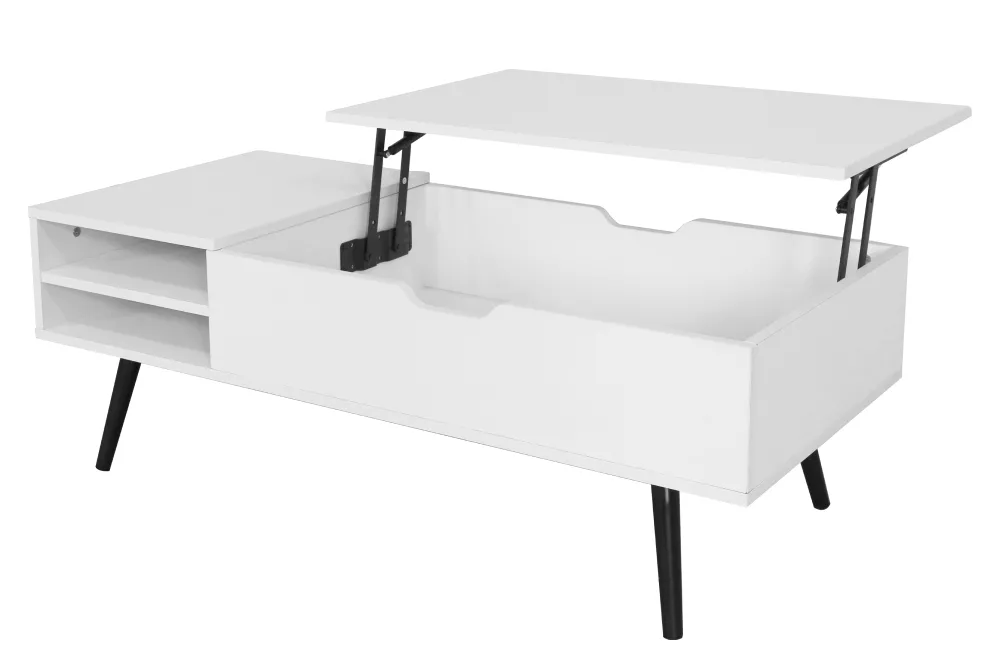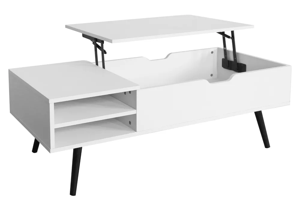 Zdvíhací mechanizmus umožňuje plynulé nadvihnutie hornej dosky až do výšky 54 cm, pod ktorou sa nachádza praktický úložný priestor ideálny na uloženie ovládačov, časopisov alebo drobností. Súčasťou stolíka je aj otvorená polica, ktorá zvyšuje jeho funkčnosť a prehľadnosť.