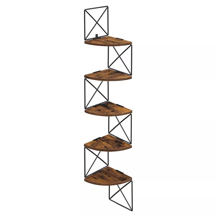 Nástenná rohová polica v dekore old wood prepája teplé hnedé tóny MDF dosiek s čiernym kovovým rámom, ktorý zaisťuje stabilitu a dodáva policiam výrazný industriálny charakter. Konštrukciu tvorí päť segmentov v tvare štvrťkruhu, vzájomne prepojených kovovými prvkami s krížovým vzorom ? celok pôsobí pevne a zároveň vzdušne.