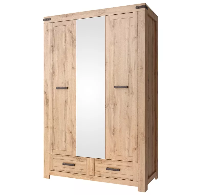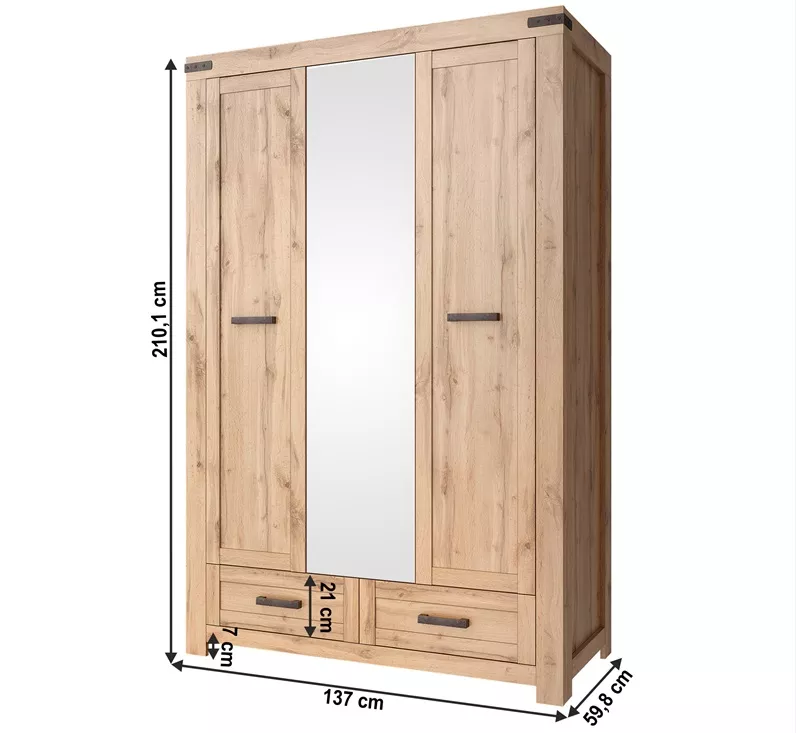 Skriňa ponúka premyslené vnútorné usporiadanie, ktoré kombinuje niekoľko typov úložného priestoru . Dve skrinky poskytujú dostatok miesta na oblečenie aj doplnky - v jednej z nich sa nachádza vešiaková tyč doplnená policou, druhá je vybavená policami na prehľadné uloženie zložených vecí. Súčasťou sú aj dva praktické šuplíky , vhodné pre drobnejšie odevy alebo každodenné potreby. Dominantným a zároveň veľmi praktickým prvkom je veľké zrkadlo na čelnej strane skrine, ktoré opticky zväčšuje priestor a zvyšuje komfort pri každodennom používaní. Skriňa stojí na nožičkách , ktoré odľahčujú jej vzhľad a uľahčujú upratovanie pod nábytkom. Dodávaná je v demontovanom stave.