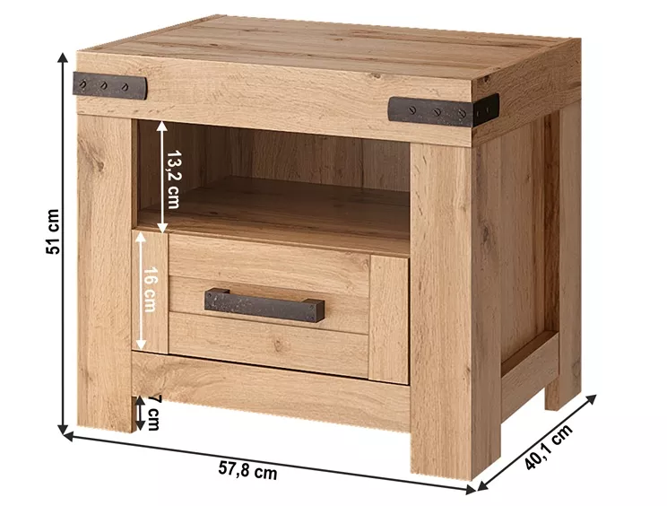 Nočný stolík ponúka kombinovaný úložný priestor , ktorý je ideálny pre každodenné používanie. Uzavretý šuplík poskytne miesto na uloženie drobností, ktoré chcete mať po ruke, ale zároveň mimo dohľadu, zatiaľ čo otvorená odkladacia plocha je vhodná napríklad pre knihu, mobilný telefón alebo budík. Korpus je vyrobený z laminovanej drevotriesky, čelnej časti z MDF , čo prispieva k pevnosti a stabilite celého kusu nábytku. Stolík stojí na nožičkách , ktoré ho opticky odľahčujú a uľahčujú upratovanie pod nábytkom. Dodávaný je v demontovanom stave.