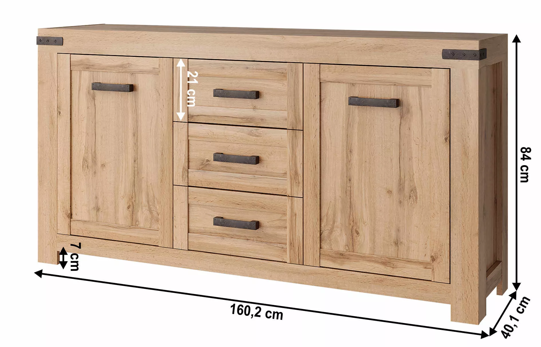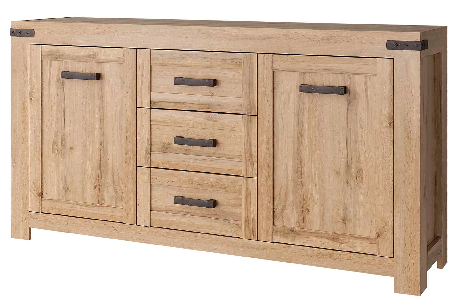 Komoda je dvojdverová a ponúka premyslené usporiadanie úložného priestoru. Za dvierkami sa nachádzajú police , ktoré poskytujú dostatok miesta na uloženie riadu, textílií, dokumentov alebo ďalších každodenných potrieb. Ďalší úložný priestor tvoria tri zásuvky, ktoré sú ideálne na drobnosti a veci, ktoré chcete mať ľahko a rýchlo po ruke. Korpus komody je vyrobený z laminovanej drevotriesky, dvierka sú z MDF , čo prispieva k pevnosti a stabilite celého kusu nábytku. Komoda stojí na nožičkách, ktoré nábytok opticky odľahčujú a zároveň uľahčujú upratovanie pod ním.