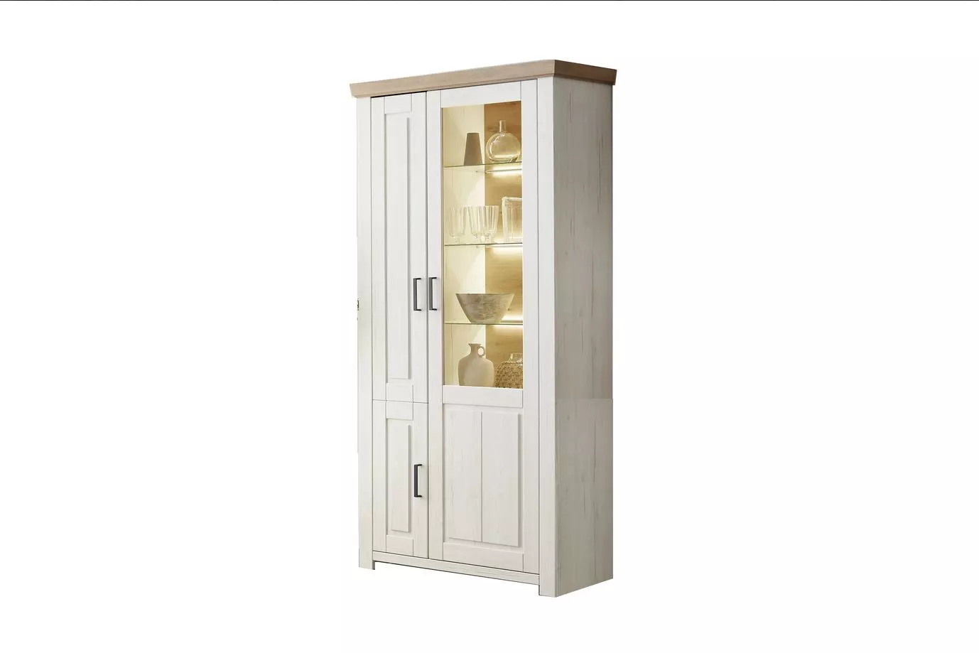 Korpus je vyrobený z laminovanej drevotrieskovej dosky s hrúbkou 16 mm, vybrané police majú hrúbku 22 mm. Predné plochy sú z MDF dosky s hrúbkou 19 mm, ktorá je vákuovo lisovaná fóliou pre vyššiu odolnosť a jednoduchú údržbu. Úchytky sú kovové v čiernej farbe, rozteč 128 mm. Použité závesy sú polonaložené aj naložené, priemer 35 mm. Výplň presklenej časti tvorí číre ploché bezpečnostné sklo.