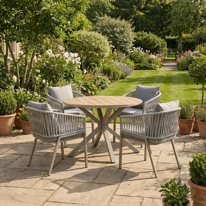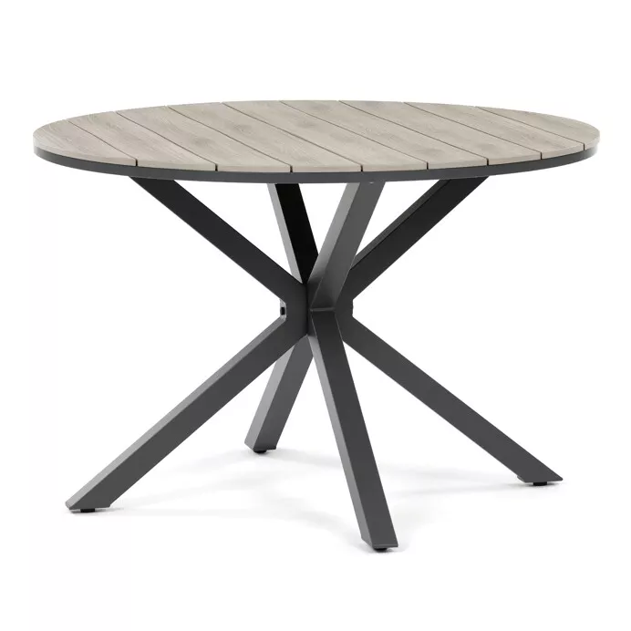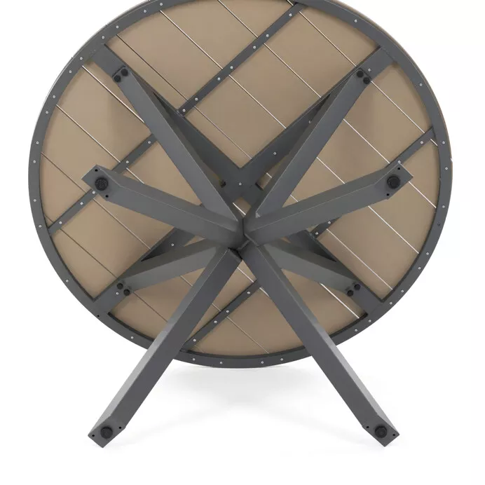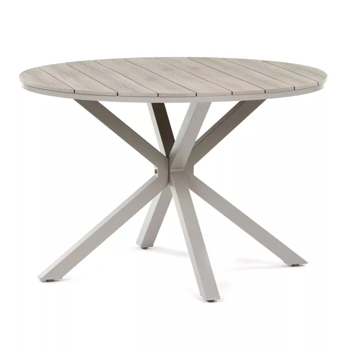 Záhradný stôl s rozmermi 110 × 110 cm predstavuje ideálne spojenie moderného designu, odolných materiálov a praktického využitia. Vďaka kruhovej doske v dekore divoký dub pôsobí prirodzene a elegantne, zatiaľ čo béžové alebo šedé prevedenie dodáva celku svieži a nadčasový vzhľad. Skvele zapadne na terasu, záhradu aj do pergoly.