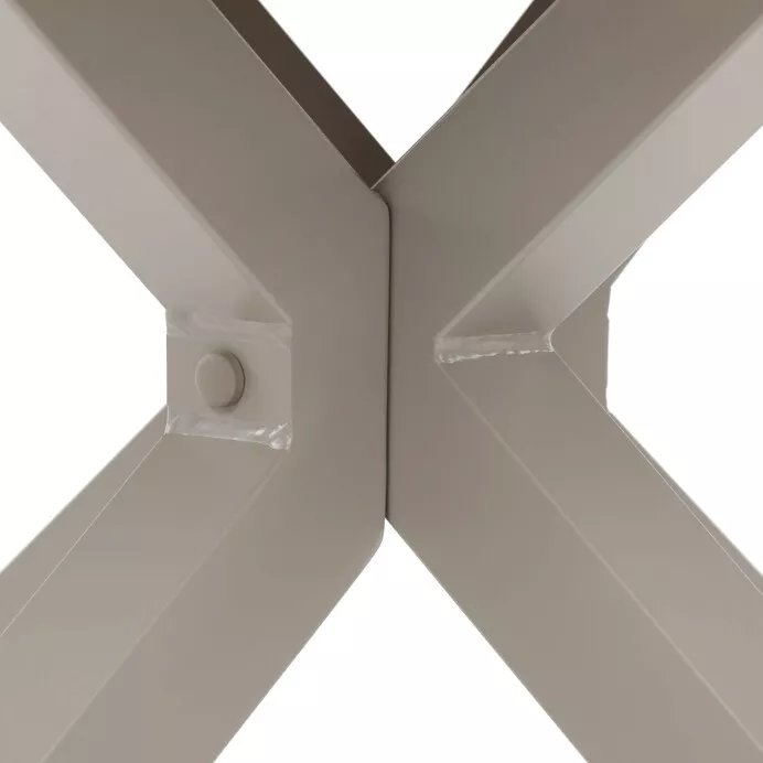 Pevná hliníková konštrukcia zaisťuje stabilitu a dlhú životnosť. Stôl stojí na štvornohej podnoži z hliníka v šedom odtieni, ktorá poskytuje bezpečné a pevné postavenie aj na mierne nerovnom povrchu. Hliník je ľahký, ale zároveň dostatočne pevný, čo uľahčuje manipuláciu bez straty stability.