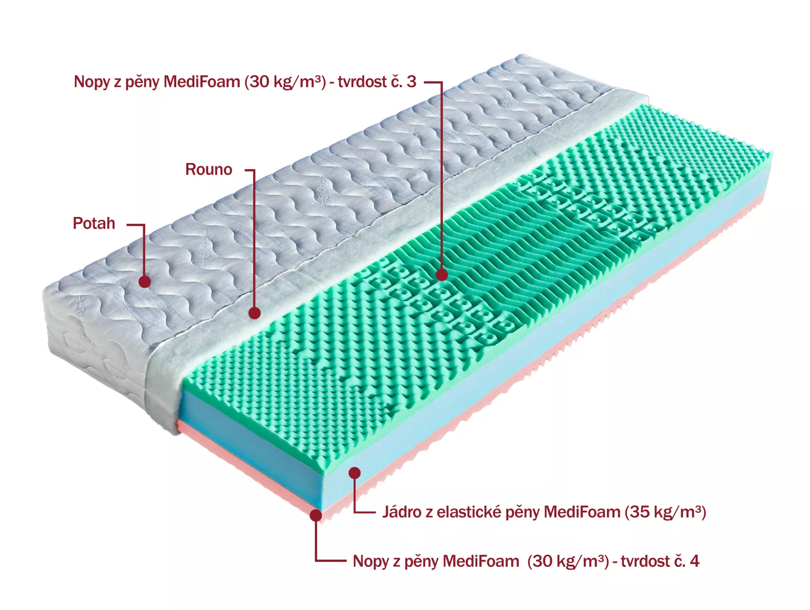 Základom matraca sú vysokogramážne a dlhodobo overené peny. Stred jadra tvorí pena s objemovou hmotnosťou 35 kg/m³, ktorá zabezpečuje pevnú a stabilnú oporu chrbtice. Nosné vrstvy sú vyrobené z pien s objemovou hmotnosťou 30 kg/m³ a líšia sa tvrdosťou podľa jednotlivých strán.