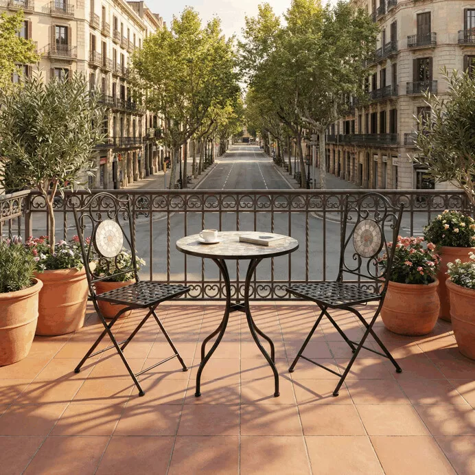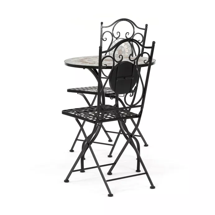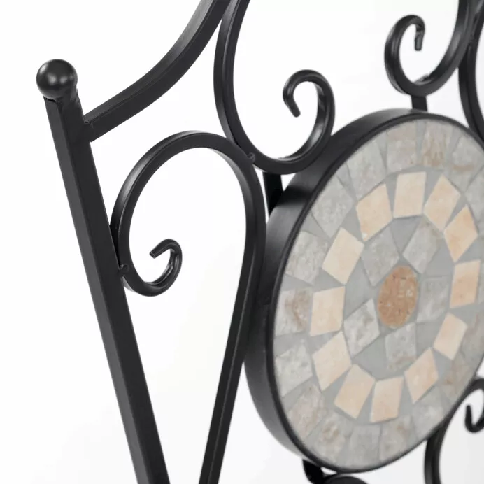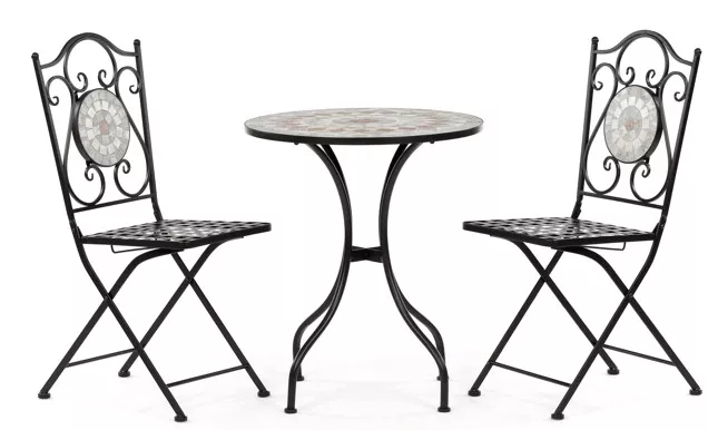 Záhradný set US1400 tvorí okrúhly stôl a dve stoličky s pevnou kovovou konštrukciou v čiernom prevedení. Vďaka kombinácii kovu a keramickej mozaiky pôsobia elegantne a zároveň dekoratívne. Štýl Provence dodáva setu romantický nádych a robí z neho ideálnu voľbu pre balkón, terasu aj záhradu.