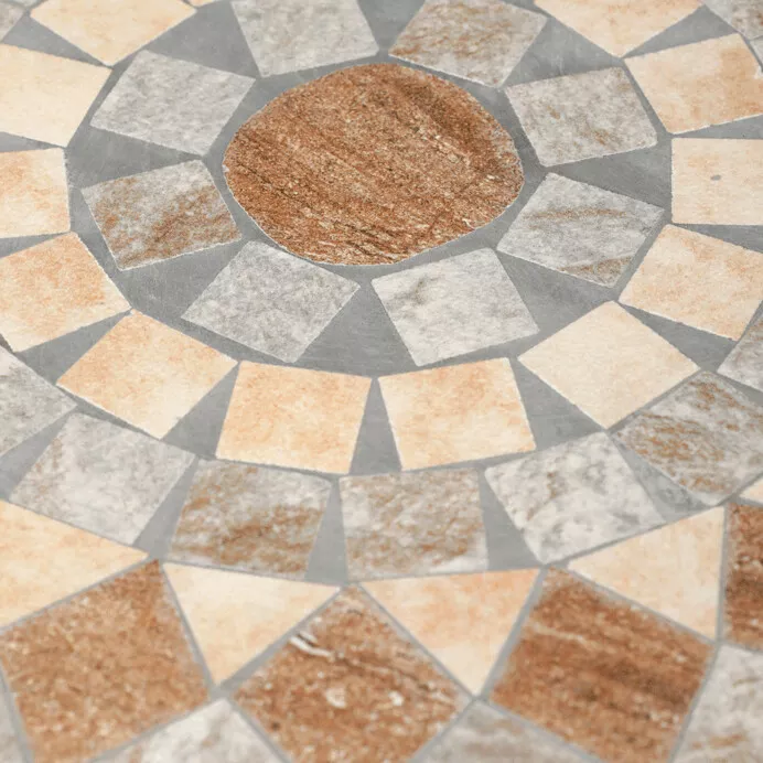 Doska stola je vyrobená z keramickej mozaiky v prírodných odtieňoch, ktoré vytvárajú atraktívny vzor. Keramika je odolná, ľahko sa čistí a zachováva si svoj vzhľad aj pri vonkajšom používaní. Stabilná štvornohá kovová konštrukcia zaisťuje pevnosť a dlhú životnosť.
