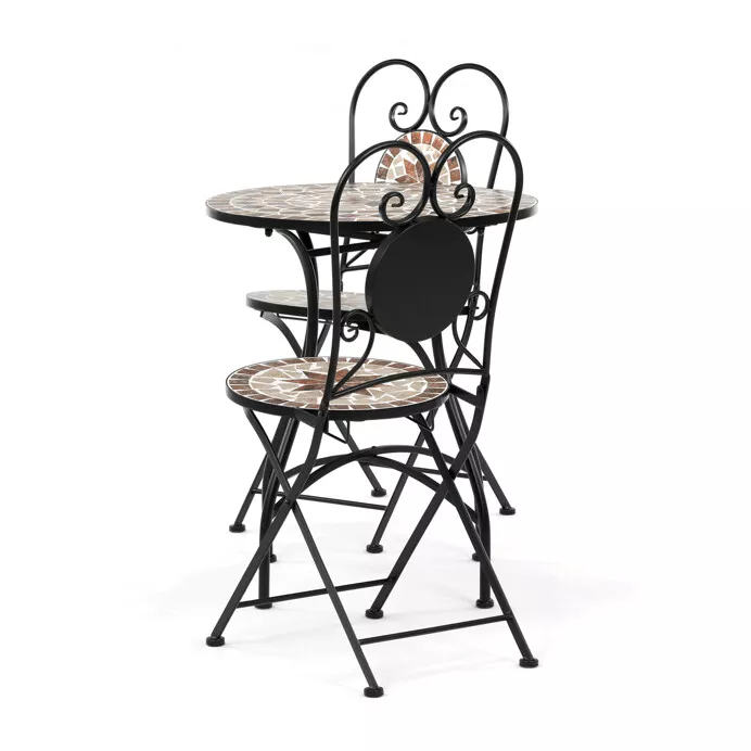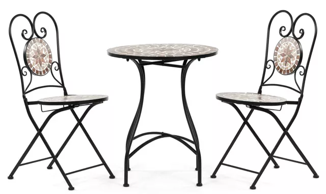 Romantický záhradný set zložený z okrúhleho stola a dvoch stoličiek je ideálnou voľbou pre balkón, terasu aj menšiu záhradu. Kombinuje pevnú kovovú konštrukciu s dekoratívnou keramickou mozaikou, ktorá dodáva celku výrazný vizuálny charakter a nádych štýlu Provence.